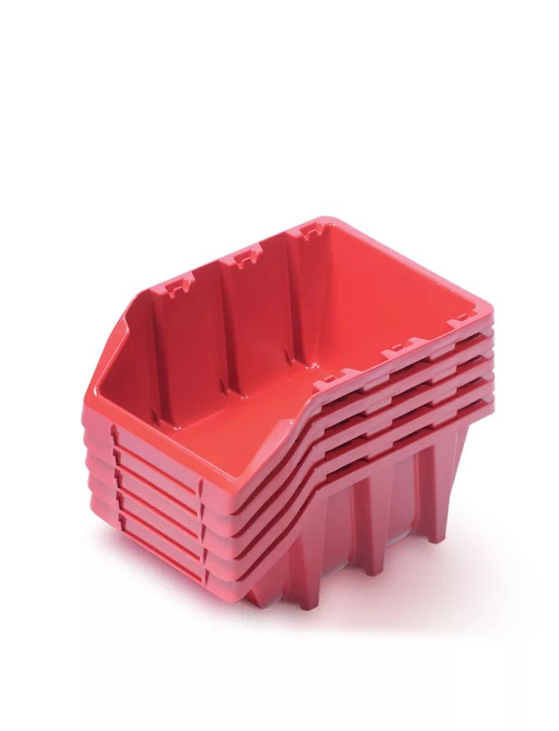 5 darabos hosszúkás műhelytároló készlet, amely ideális alkatrészek és szerszámok rendszerezett tárolására. Összekapcsolható és egymásra építhető elemekkel a maximális helykihasználásért.