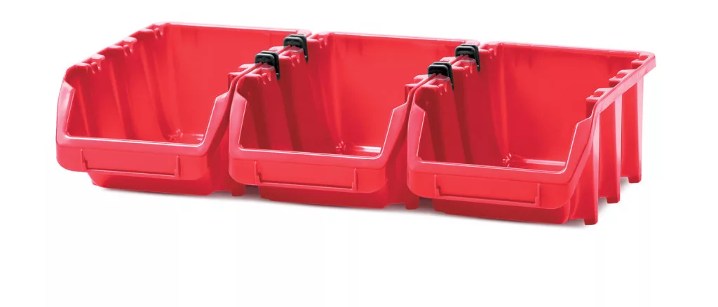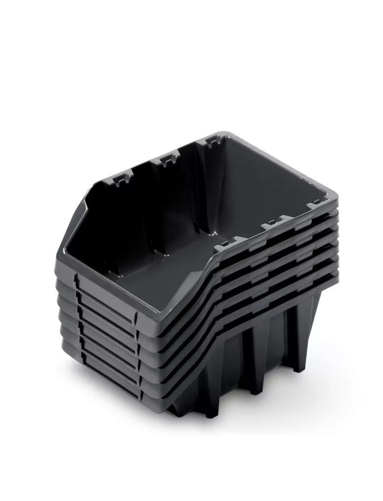 6 darabos, strapabíró műanyag tárolódoboz készlet műhelyekbe, amely összekapcsolható és egymásra helyezhető elemekből áll.