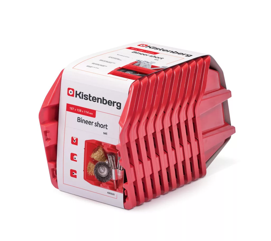 A Kistenberg Bineer Short tárolódoboz készlet forradalmasítja a műhelyi tárolást. A 10 darabos készlet tartós polimerből készült, egymásra építhető tárolódobozokból áll, amelyek optimális megoldást kínálnak szerszámok, csavarok és egyéb műhelyi kellékek tárolására.