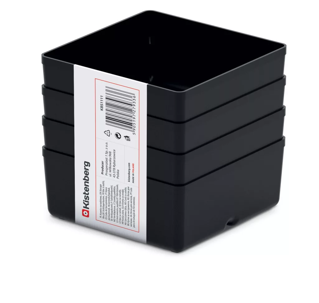 A Unite Box KBS1111 műhelytároló pohár készlet ideális megoldást kínál a műhelyben használt kisebb alkatrészek, szerszámok és tartozékok rendszerezett tárolására. A négy darabos készlet tagjai egyenként 110x110 mm méretűek, és kiváló minőségű, ütésálló polimerből készültek.