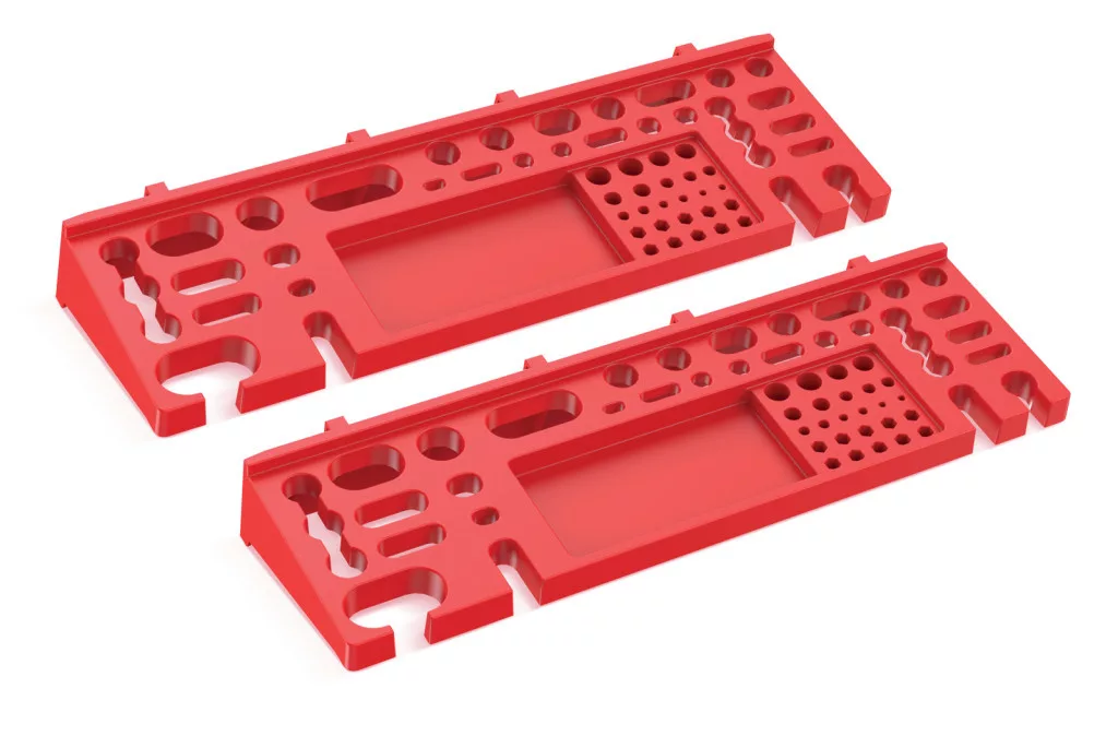 A rendszer két azonos méretű polcból áll, amelyek könnyen rögzíthetők a Bineer Board szerszámtartó falra. A piros színű polcok nem csak praktikusak, de esztétikus megjelenést is kölcsönöznek műhelyének.