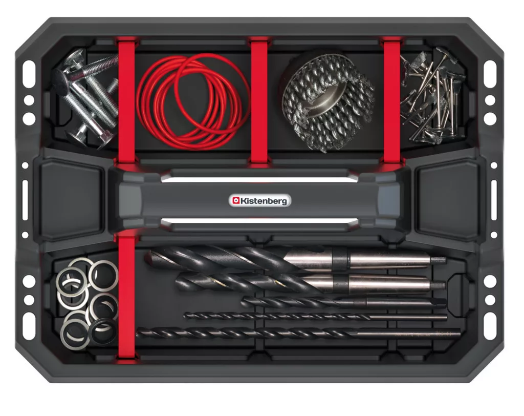 A Kistenberg Cargo Plus 40 műhelyláda a professzionális szerszámtárolás új szintjét képviseli. A megerősített polimer konstrukció és az átgondolt belső kialakítás tökéletes megoldást nyújt a szerszámok rendszerezett tárolására. A 6 kivehető rekesz lehetővé teszi a különböző méretű szerszámok és alkatrészek elkülönített tárolását.
