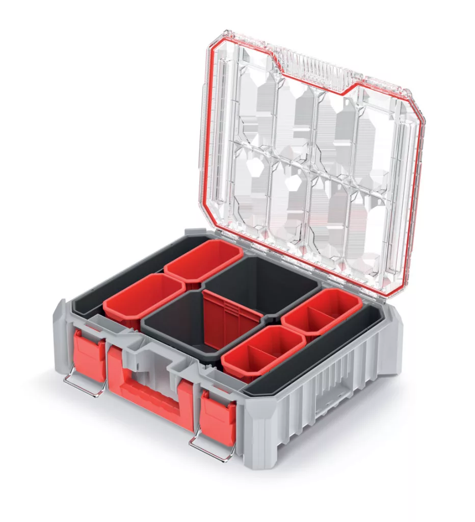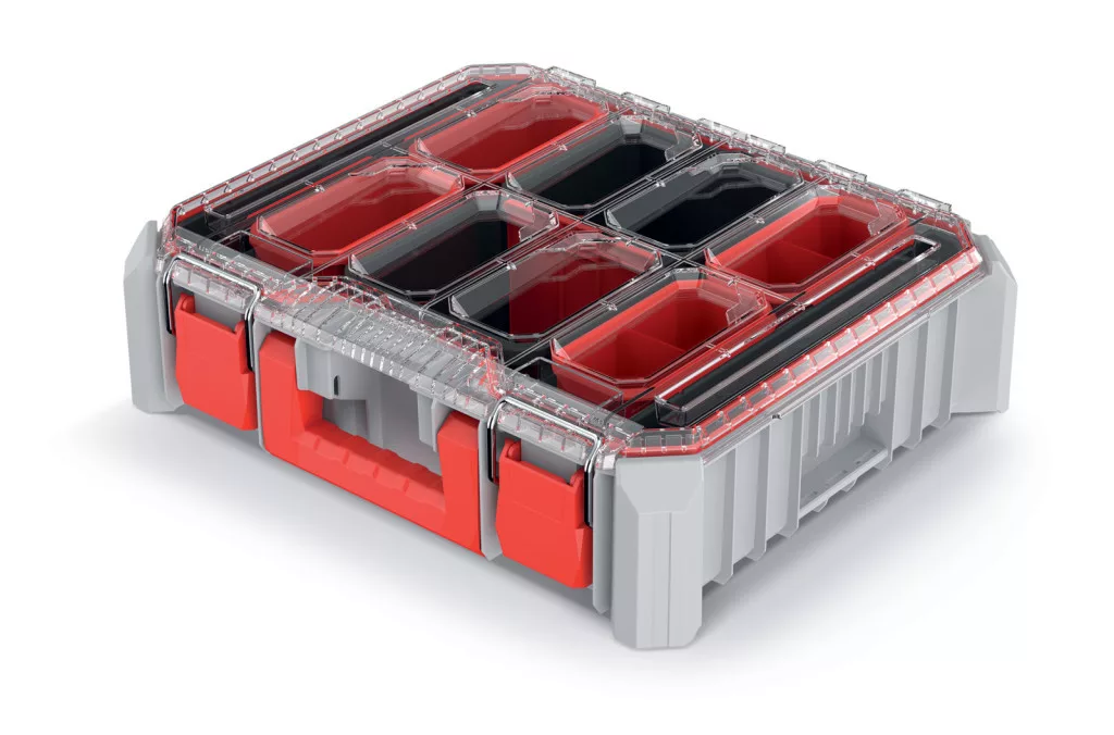 A rendező 11 kivehető tárolórekesszel rendelkezik, átlátszó polikarbonát fedéllel és IP55 védettséggel, amely megvédi a szerszámokat a portól és a nedvességtől. Az ergonomikus fogantyú és a fém-műanyag kombinációjú zárak biztosítják a kényelmes használatot és a megbízható rögzítést.
