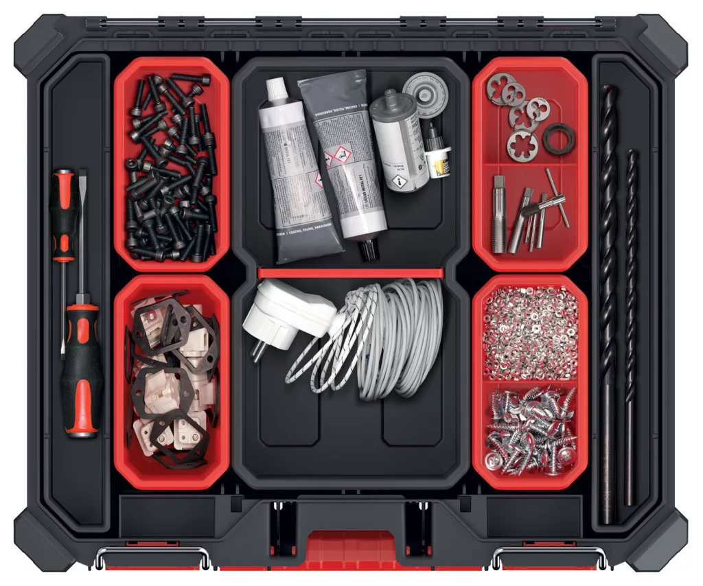 Innovatív, kettős funkciójú szerszámrendező adapter átlátszó fedéllel és 11 kivehető tárolórekesszel, amely tökéletes megoldást nyújt a kisebb alkatrészek rendszerezésére és a szerszámosládák összekapcsolására.