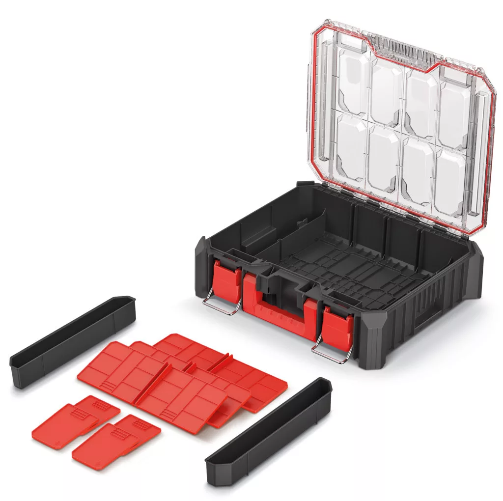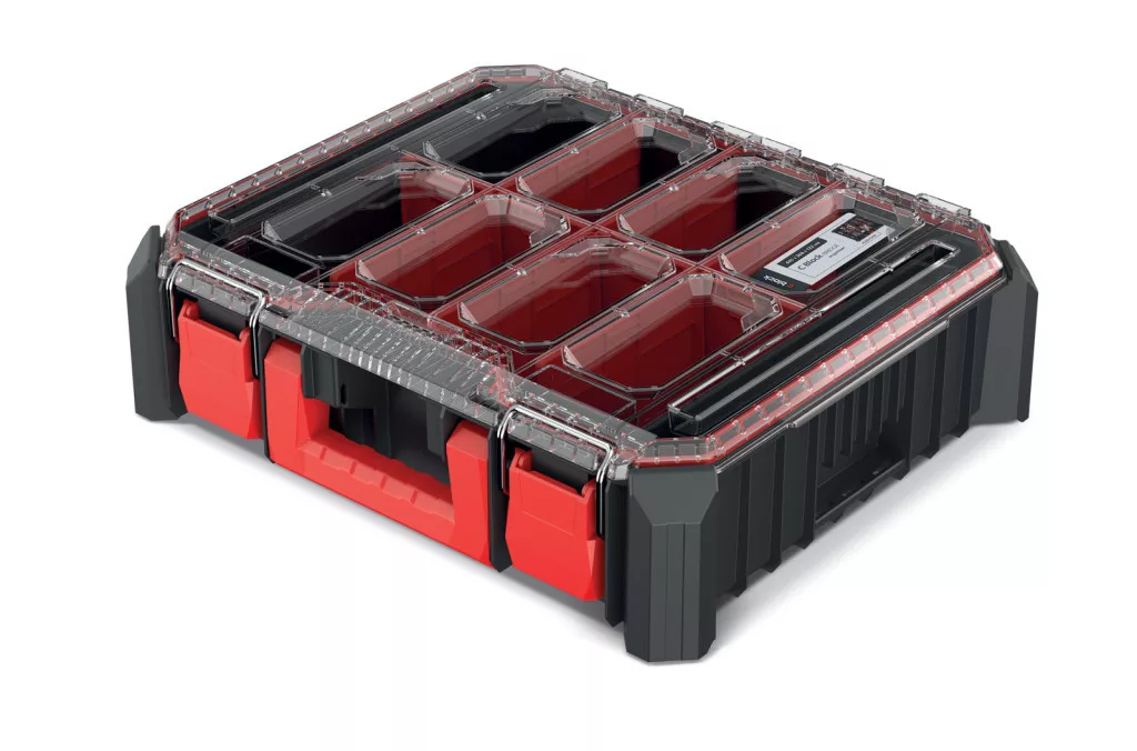 A megerősített polimer házszerkezet és a fém zsanérok tartós használatot garantálnak, míg a por- és vízálló tömítés maximális védelmet nyújt a tárolt szerszámoknak. A rendszer kompatibilis a C Block PRO, C Block ALU LOG, X Block PRO és X Block ALU LOG sorozatokkal.