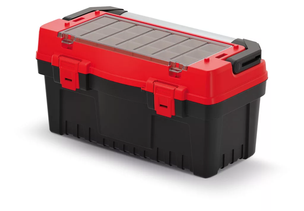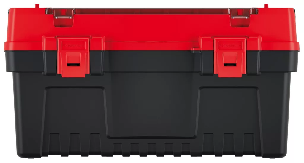Az EVO 55 szerszámosláda egyesíti a modern dizájnt és a praktikus funkcionalitást. A megerősített műanyag konstrukció és a dupla záródású piros fedél maximális védelmet nyújt a szerszámoknak, míg az átlátszó fedélbetét gyors áttekinthetőséget biztosít.