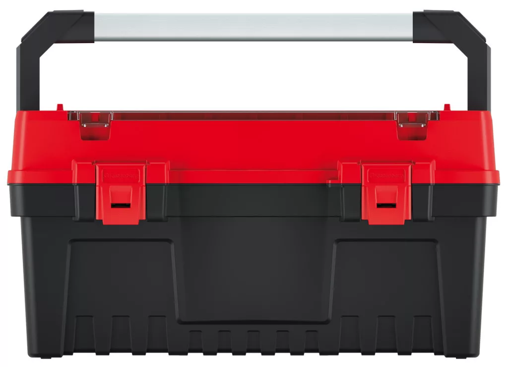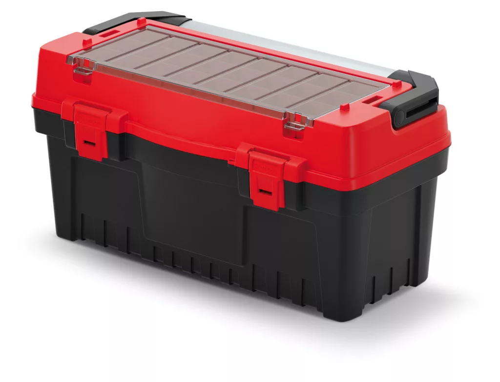 Nagyméretű, strapabíró szerszámosláda beépített rendszerezővel és 25 kg teherbírással, ideális szakemberek és barkácsolók számára.