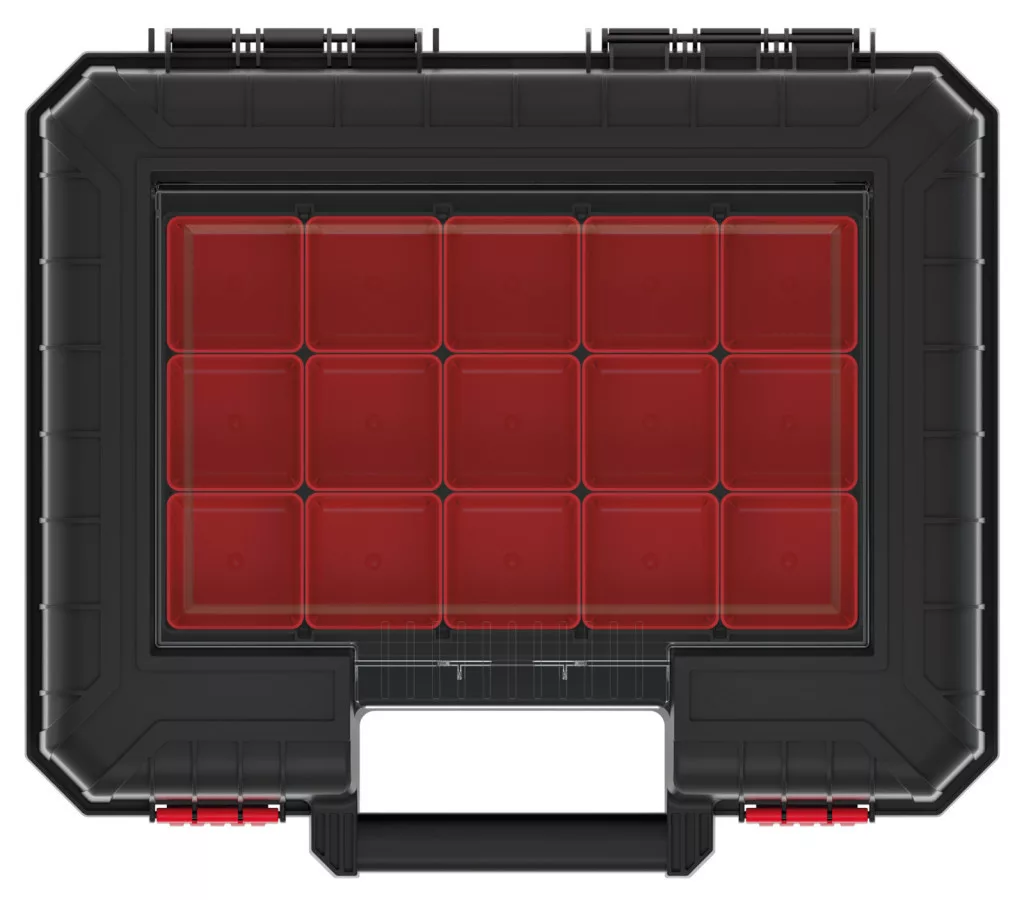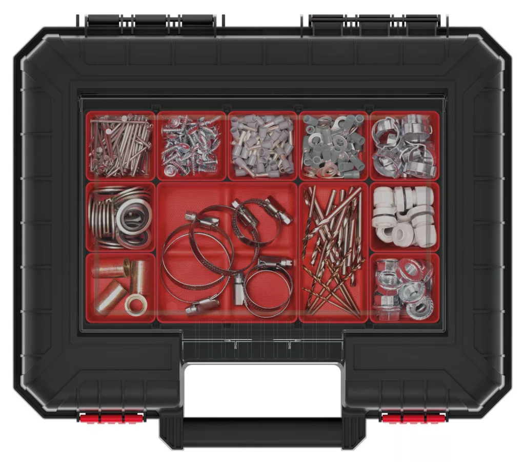 A koffer ergonomikus fogantyúval és két belső rögzítőpánttal rendelkezik, ami biztonságos szállítást tesz lehetővé. A fedélben található 7 rekeszes rendszerező ideális kisebb alkatrészek és szerszámok tárolására.
