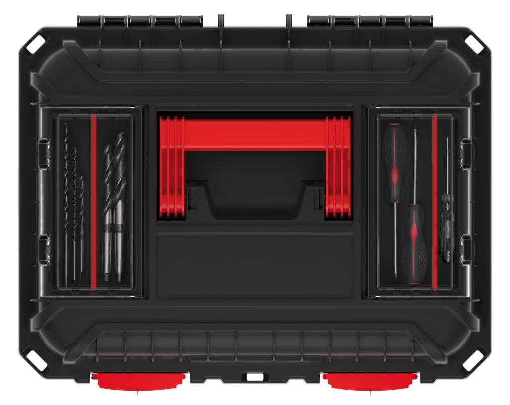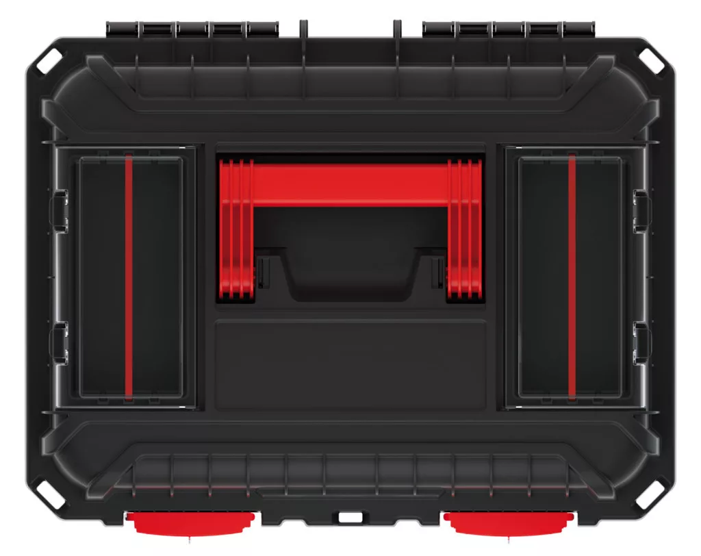 A láda tetején található két szervező rekesz kivehető elválasztókkal és pohártartókkal rendelkezik, míg a mély belső tér bőséges helyet biztosít nagyobb szerszámok számára. A tömített kialakítás védelmet nyújt a por és nedvesség ellen.
