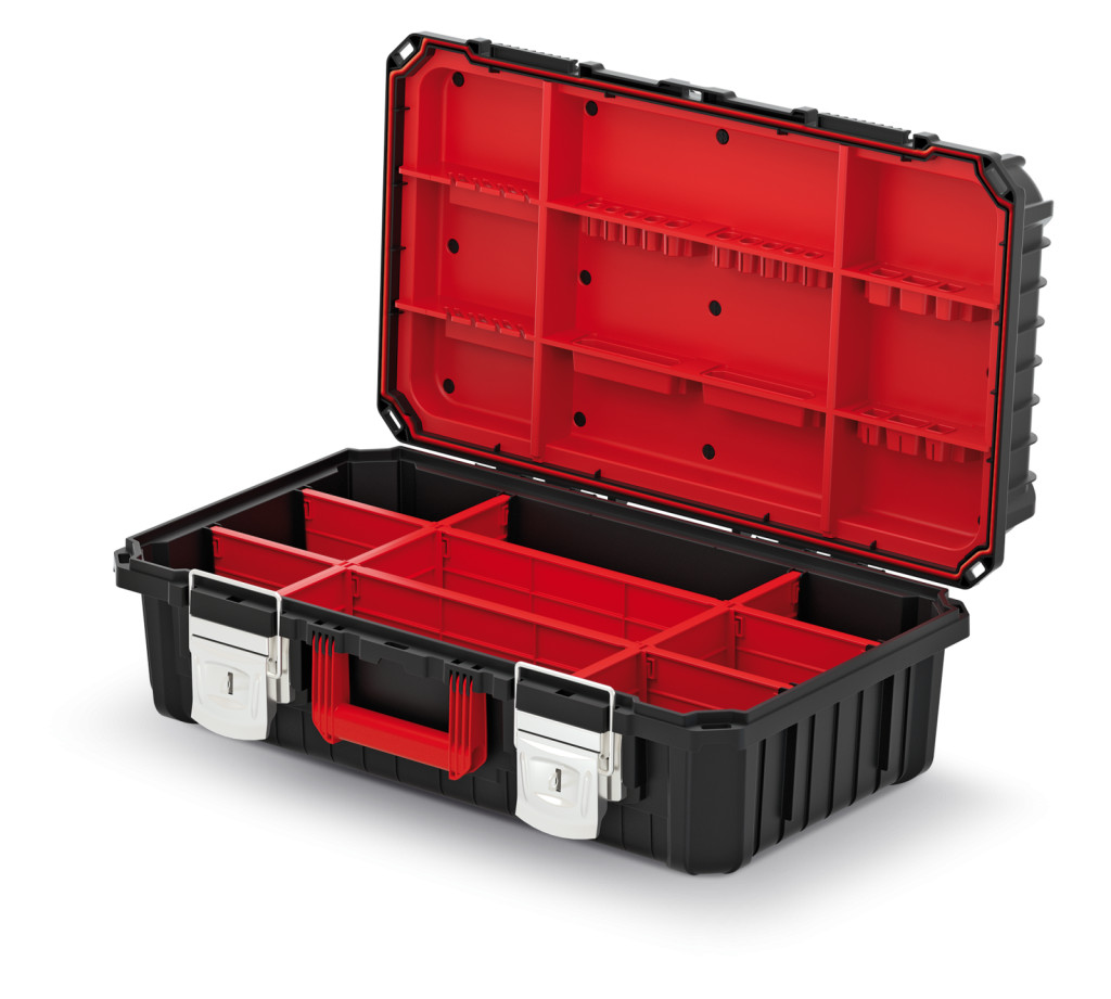 A horganyzott fém zárak és a tömör tömítés maximális védelmet nyújtanak a szerszámoknak a külső hatásokkal szemben. A dupla fogantyús kialakítás és az ergonomikus forma könnyű szállíthatóságot biztosít még teljes terhelés mellett is.