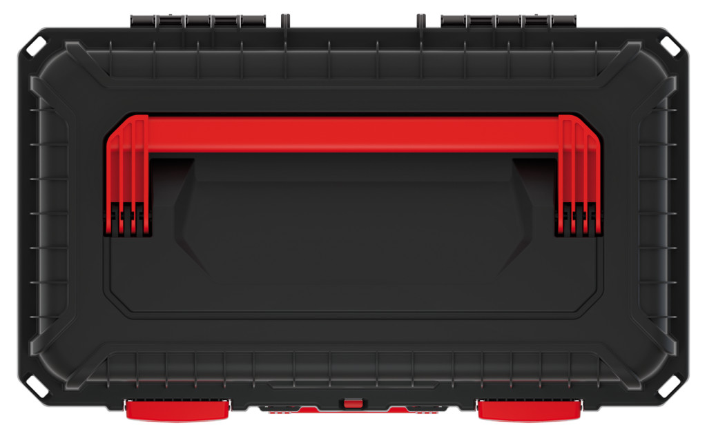 A kettős fogantyúrendszer - egy hosszú a fedélben és egy oldalsó a testen - könnyű hordozhatóságot biztosít, míg a tömítés véd a por és nedvesség ellen. A 25 kg-os teherbírás lehetővé teszi nehéz szerszámok biztonságos szállítását is.
