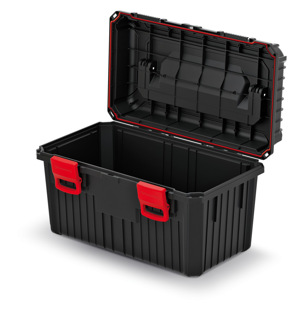 Strapabíró, nagy teherbírású szerszámosláda megerősített polimer házból, 25 kg teherbírással és kiváló védelemmel a külső hatások ellen.
