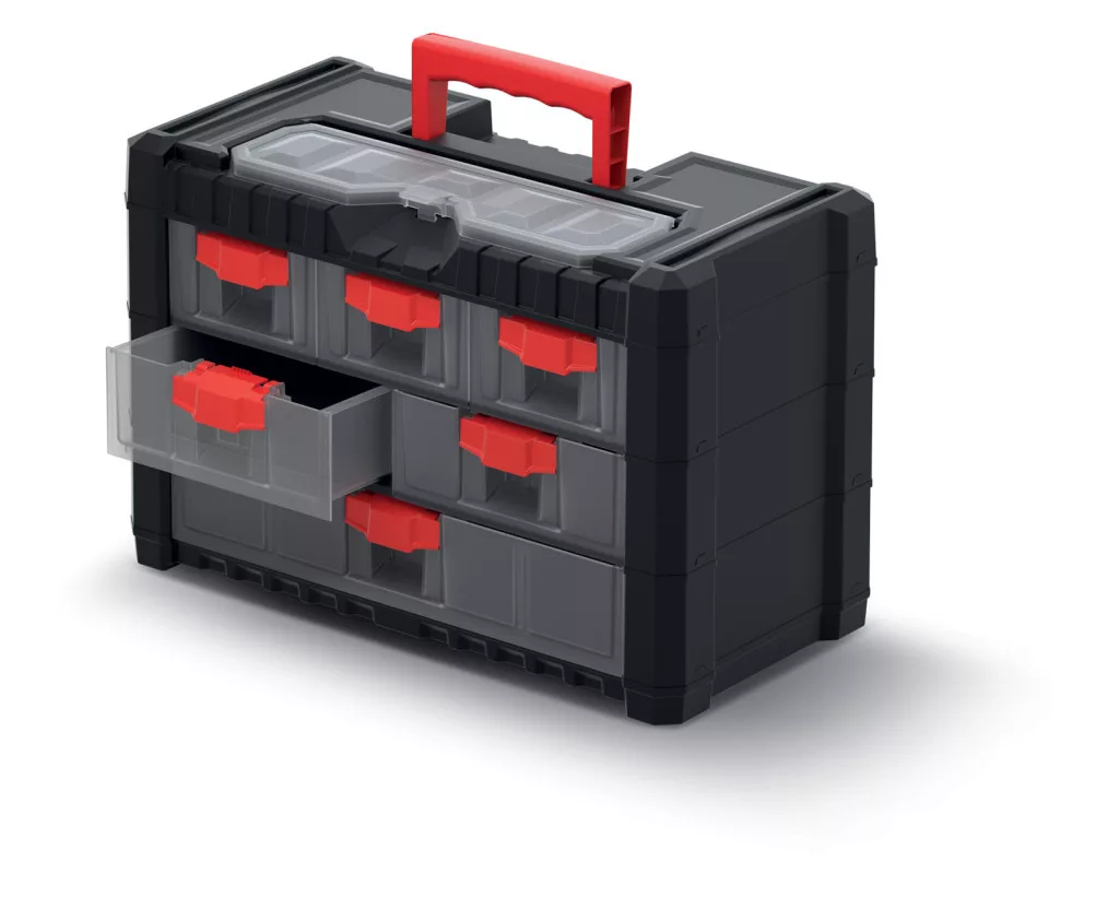 A Multicase Cargo 30 szerszámrendező egy innovatív tárolórendszer, amely tökéletes megoldást nyújt a szerszámok és kisalkatrészek rendszerezett tárolására. A megerősített polimer háznak köszönhetően tartós és strapabíró, míg a különböző méretű fiókok maximális rugalmasságot biztosítanak.