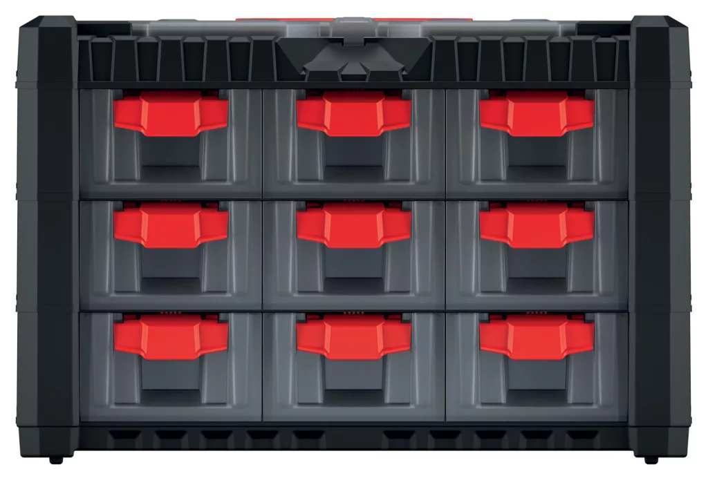 A fedélben kialakított extra tárolórekesz további helyet biztosít a gyakran használt szerszámoknak. A fiókrendszer tökéletes kisebb alkatrészek, csavarok, szerszámok rendszerezett tárolására.
