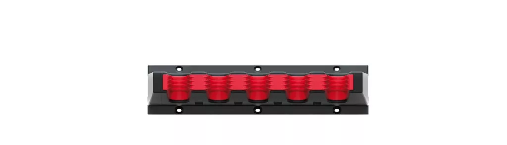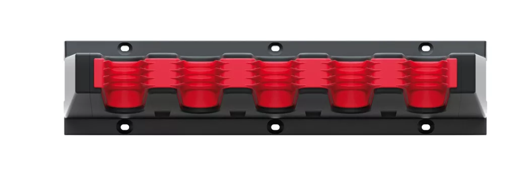 Innovatív, 5 férőhelyes szerszámtartó konzol rugalmas elasztomer betétekkel, amely tökéletesen illeszkedik különböző méretű szerszámokhoz.