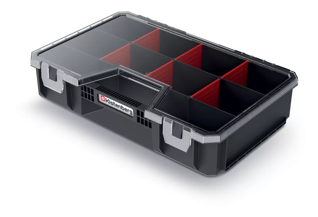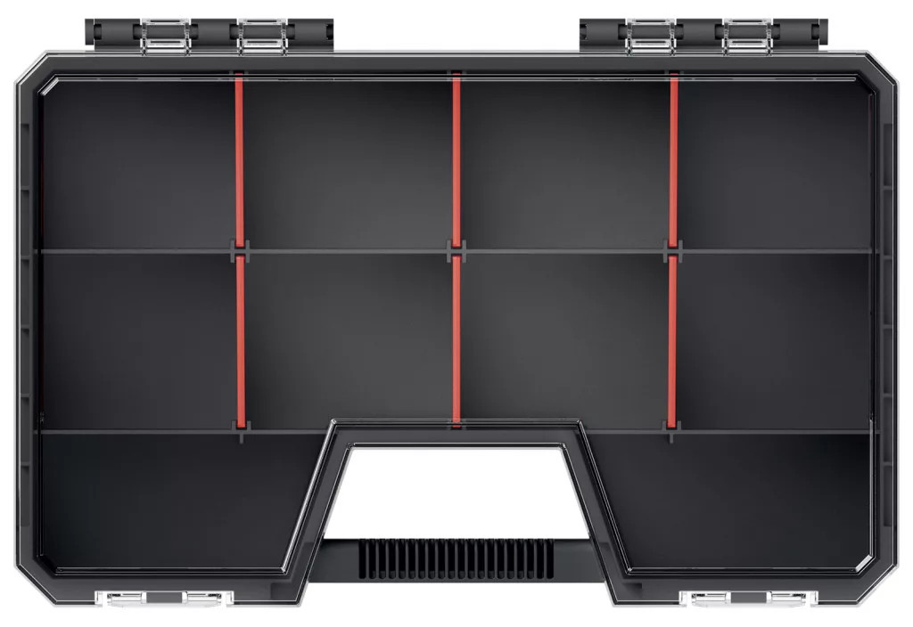 Professzionális szerszámrendező doboz 6 kivehető válaszfallal, átlátszó polikarbonát fedéllel és megerősített polimer házzal.