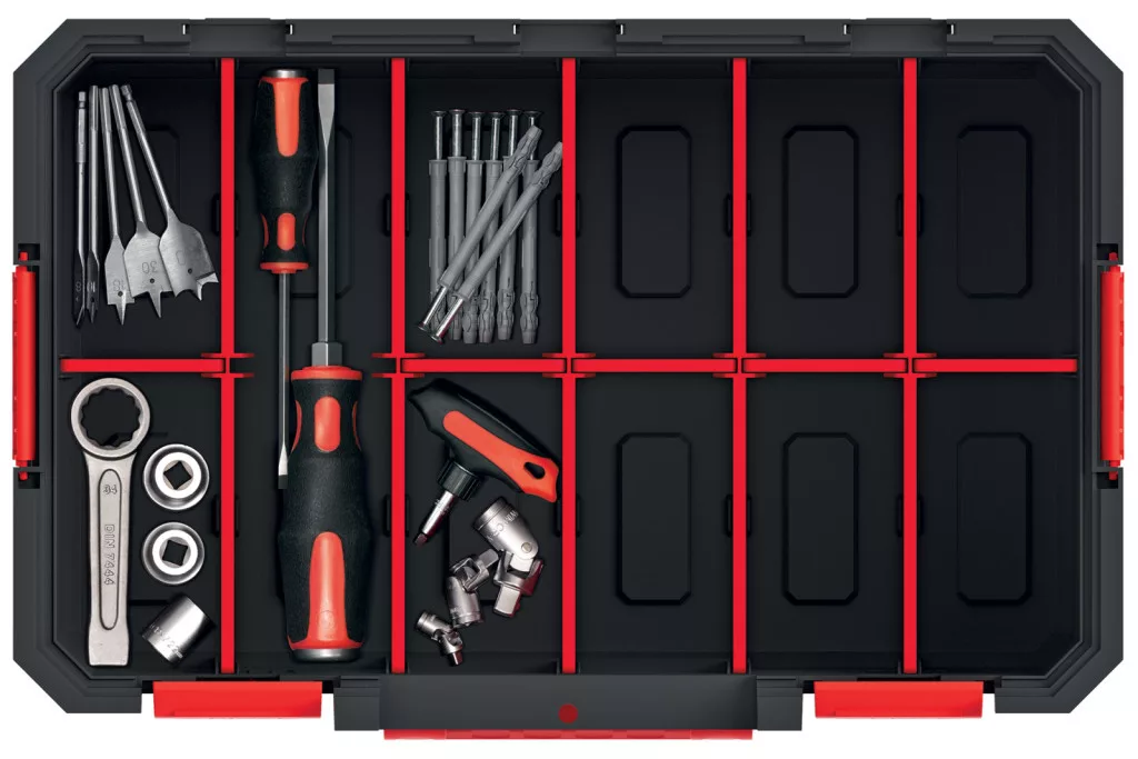 A Modular Solution 15 Plus szerszámosláda egy innovatív tárolási megoldás, amely tökéletes rendet teremt a szerszámok között. A 11 kivehető rekesznek köszönhetően személyre szabható a belső tér, így minden szerszám és alkatrész könnyen áttekinthető rendszerben tárolható.