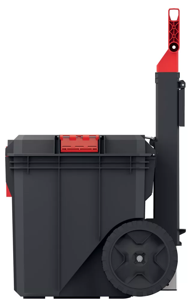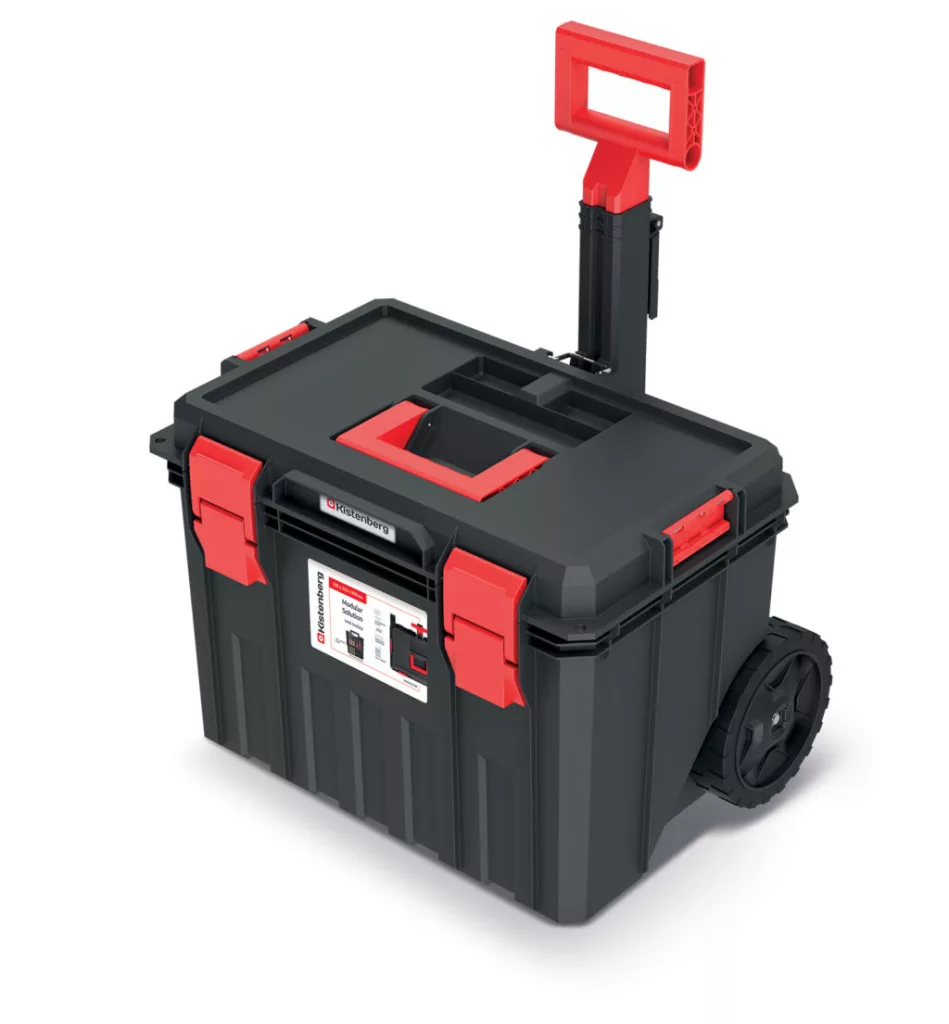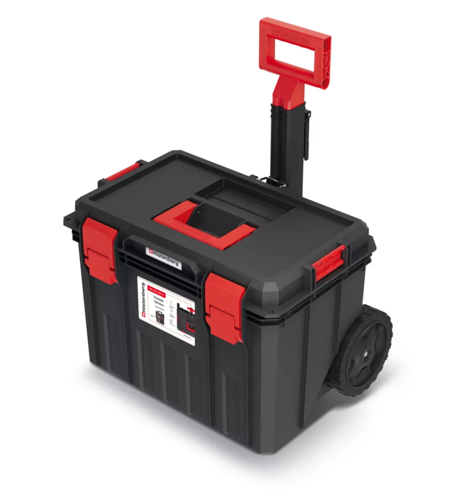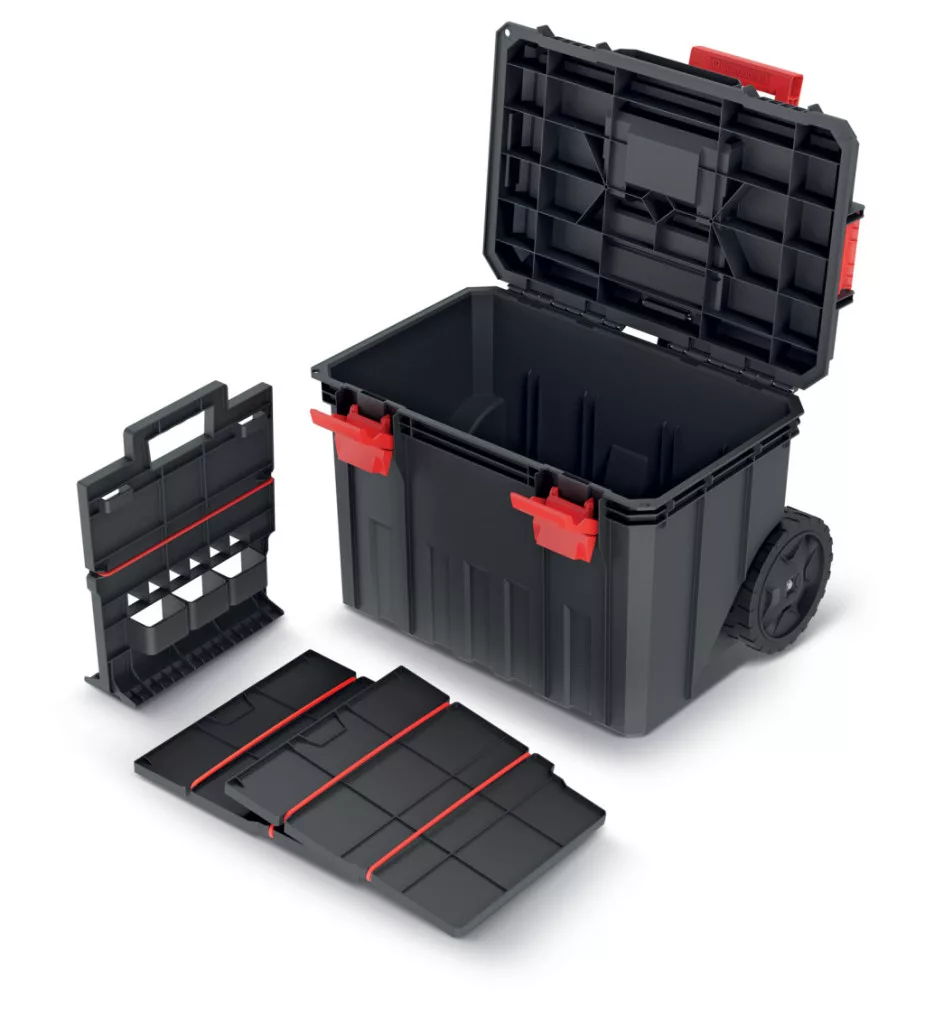 A teleszkópos fogantyú és a gumírozott kerekek könnyű manőverezhetőséget tesznek lehetővé, míg a három kivehető rekesz rugalmas belső elrendezést biztosít. Az egyik rekesz kéziszerszám-tartóként is használható, tovább növelve a láda sokoldalúságát.