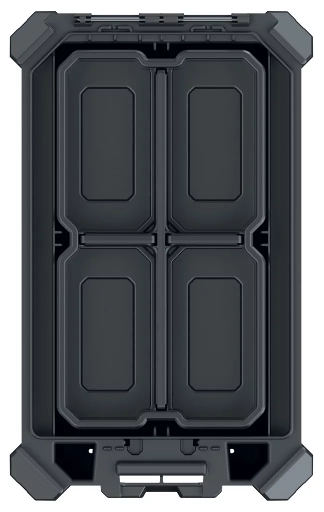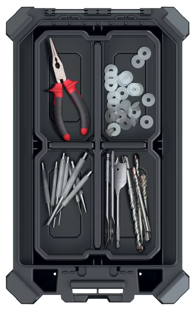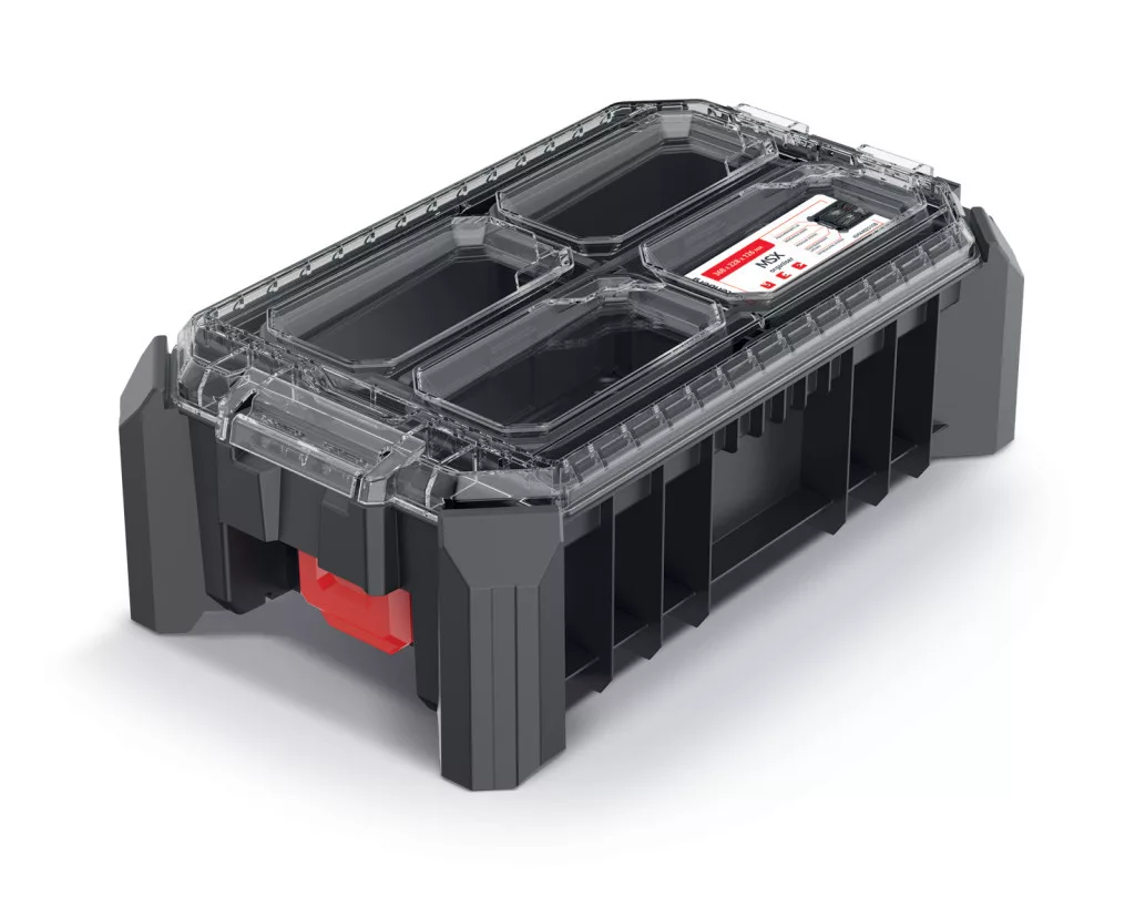 Professzionális szerszámrendező tároló kivehető elválasztókkal és tárolórekeszekkel, por- és vízálló kialakítással, kompatibilis a MSX rendszerrel.
