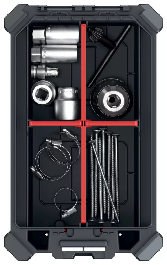 Professzionális, moduláris szerszámtároló rendszer átlátható rekeszekkel és por- és vízzáró kialakítással.