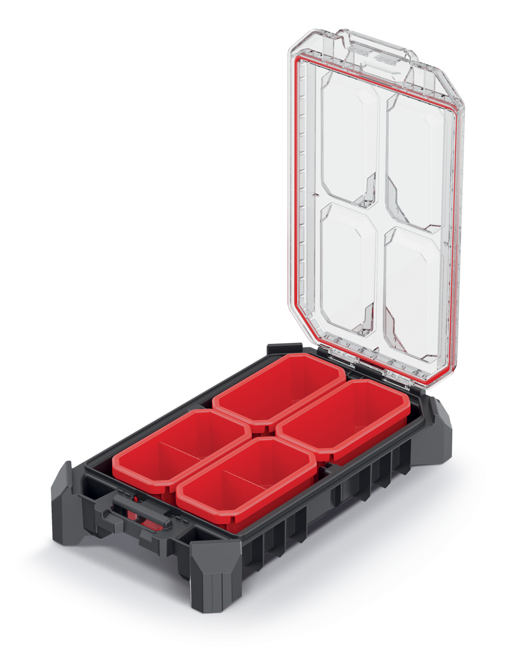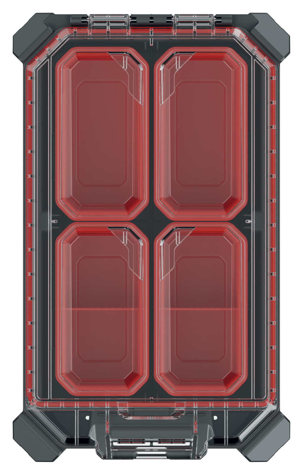 Ez a modern szerszámrendező tároló egyesíti a praktikusságot és a tartósságot. A megerősített polimer házszerkezet és a polikarbonát fedél kiváló védelmet nyújt a tárolt eszközöknek, míg a négy kivehető tároló rekesz rugalmas rendszerezést tesz lehetővé.