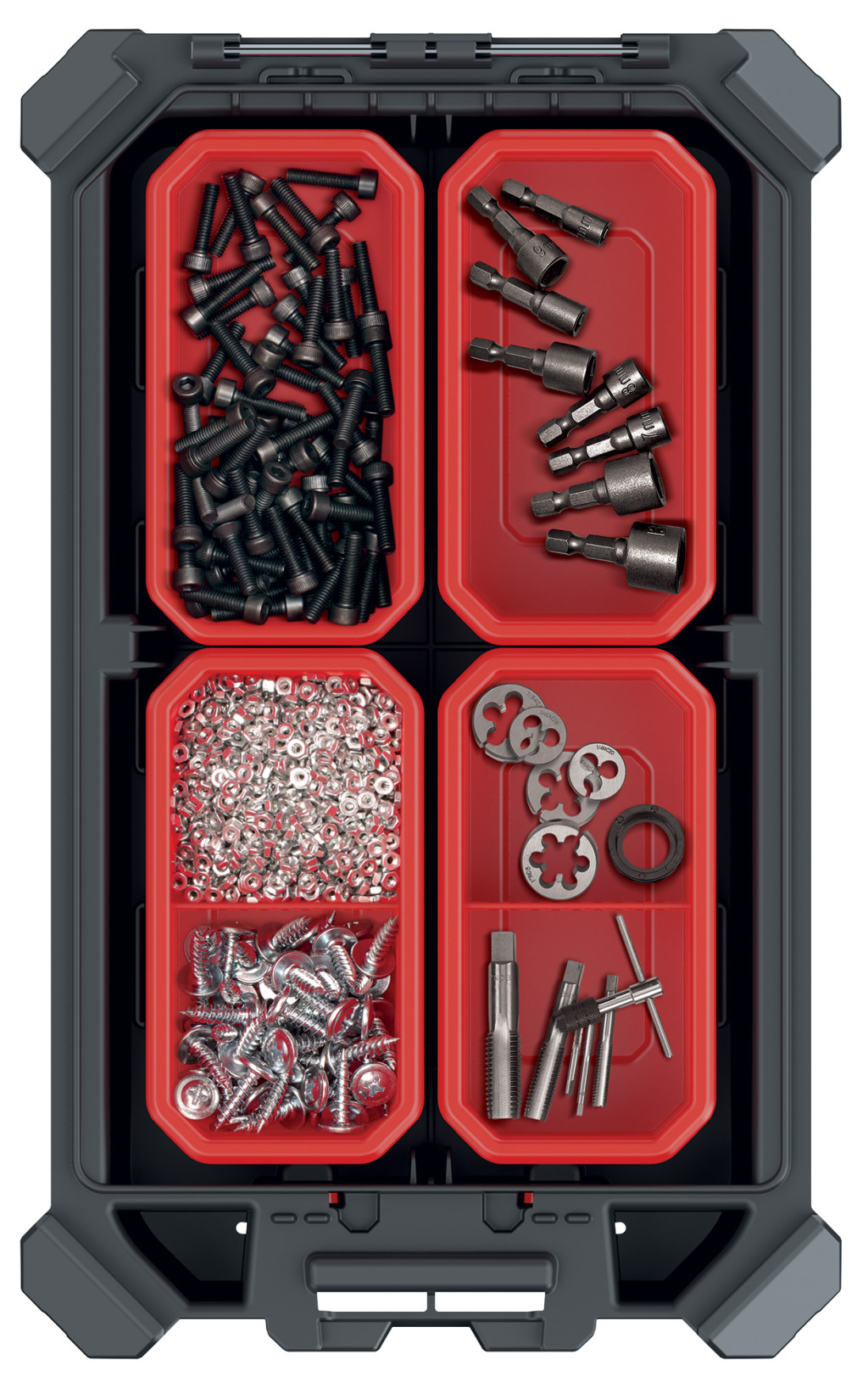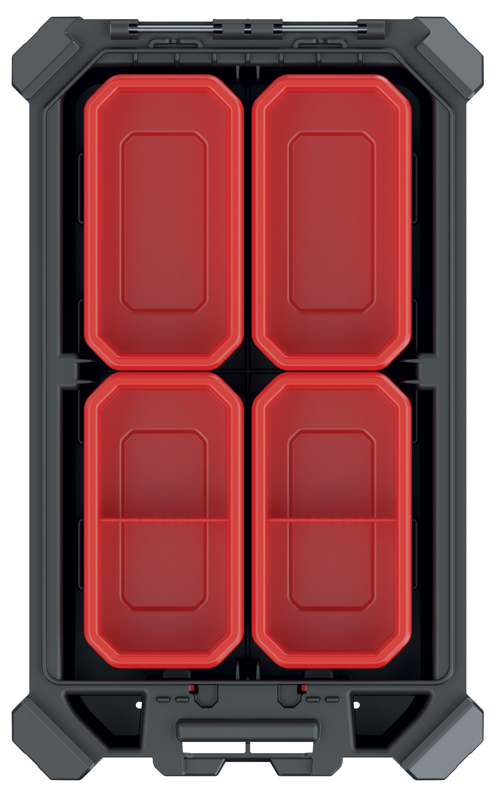 Kompakt, moduláris szerszámrendező 4 kivehető tárolórekesszel, por- és vízálló kialakítással, ideális kisebb alkatrészek és szerszámok rendszerezett tárolásához.