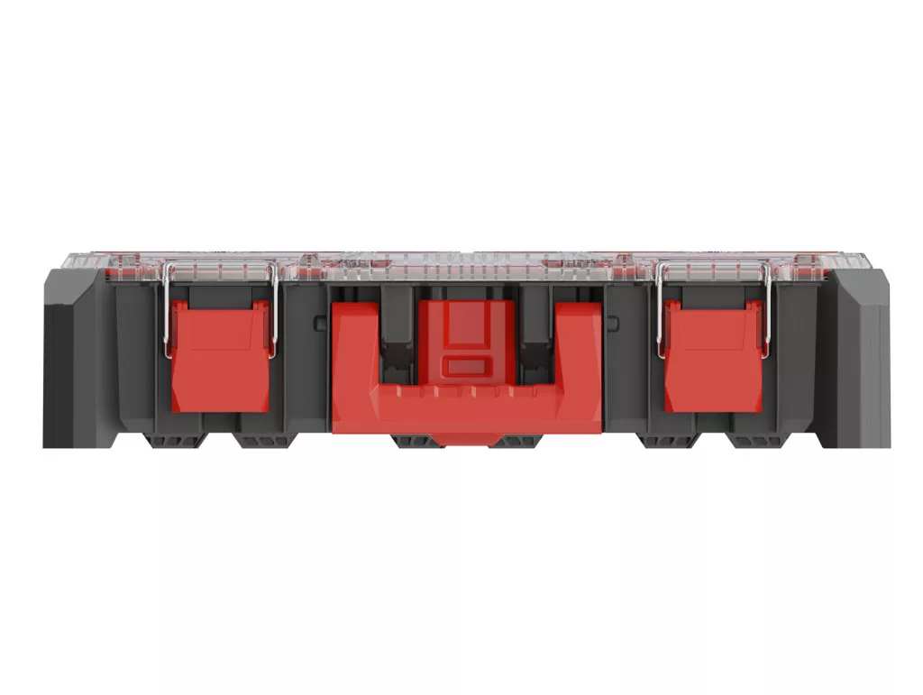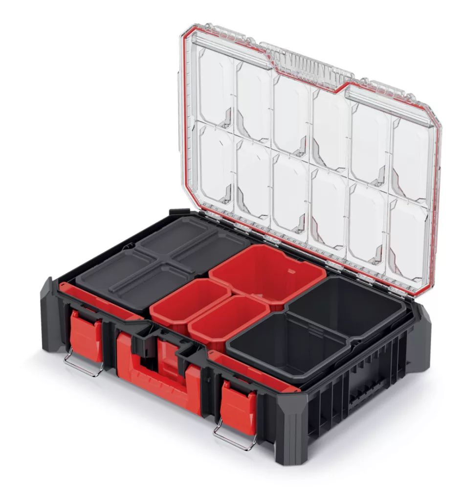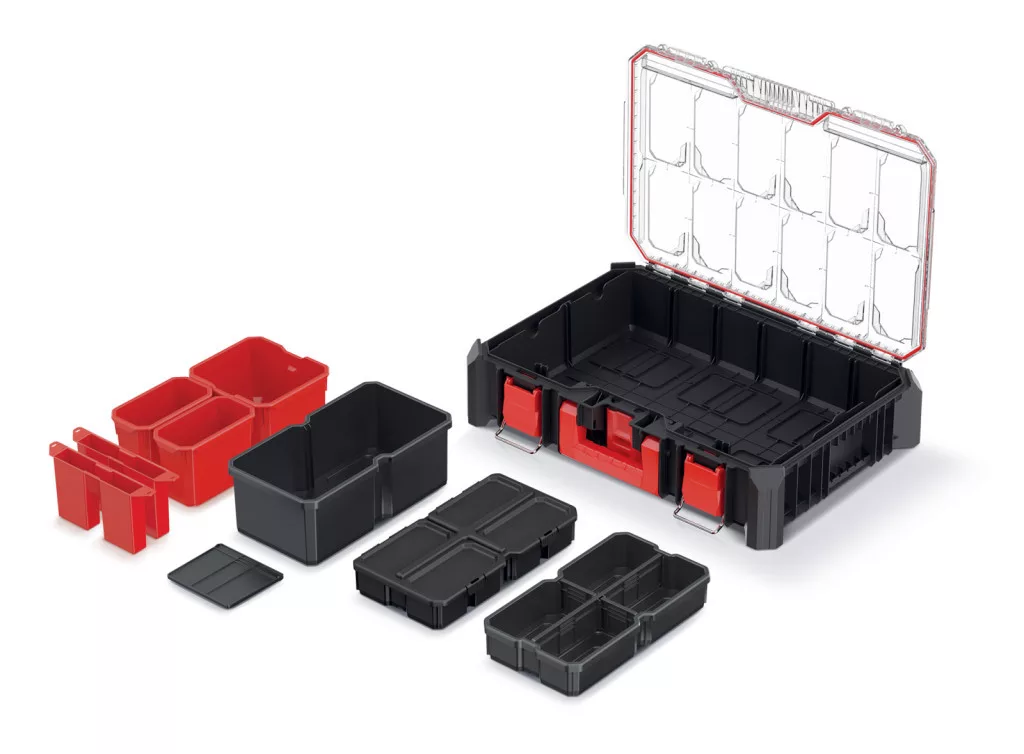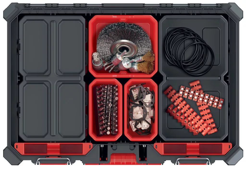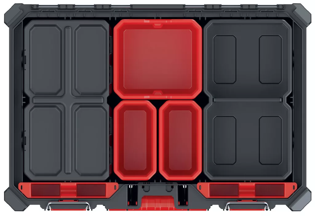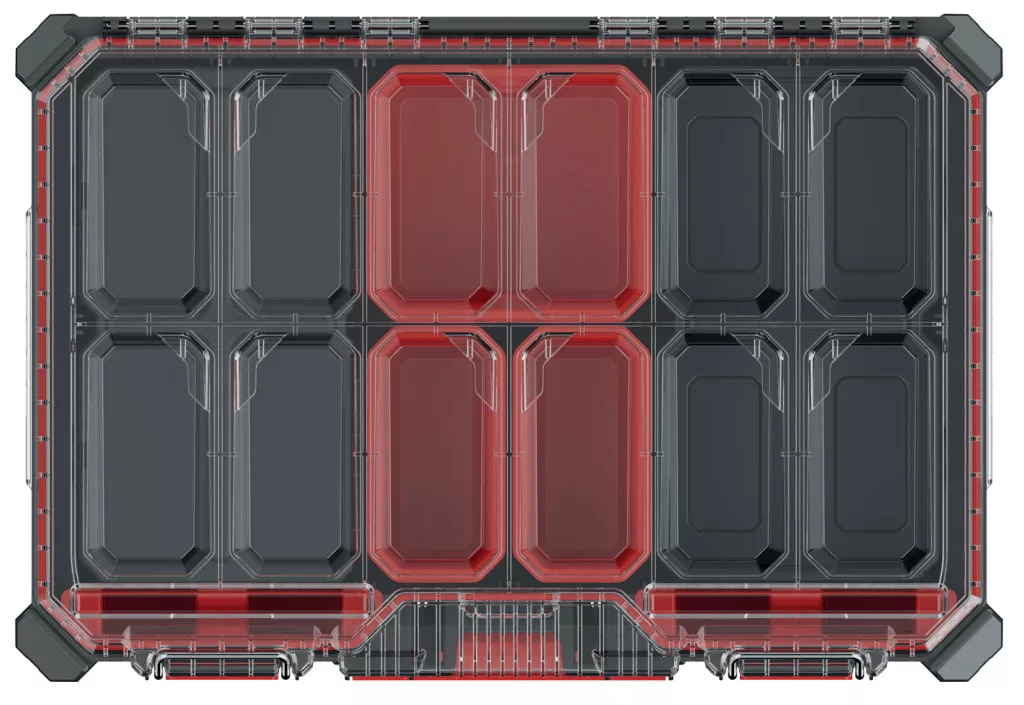 Professzionális, moduláris szerszámrendező tároló 7 kivehető tárolórekesszel és 4 állítható elválasztóval, por- és vízálló kialakítással.