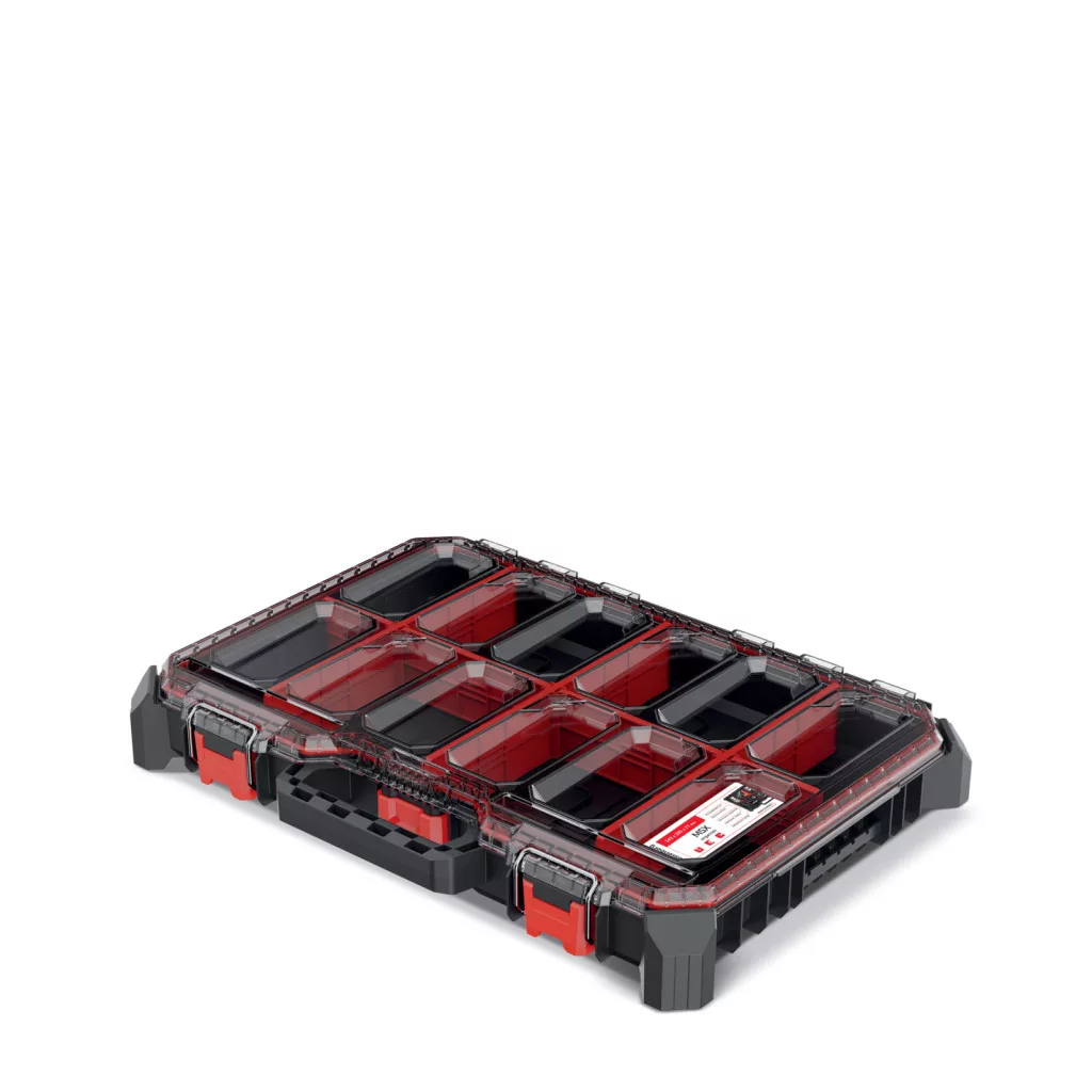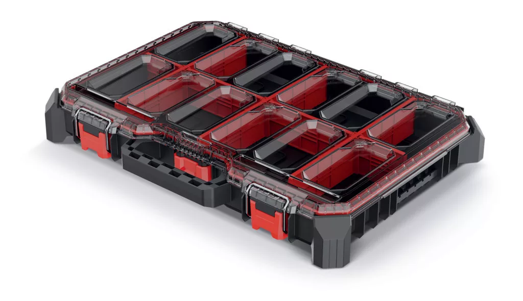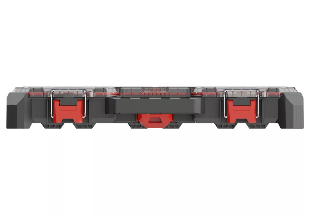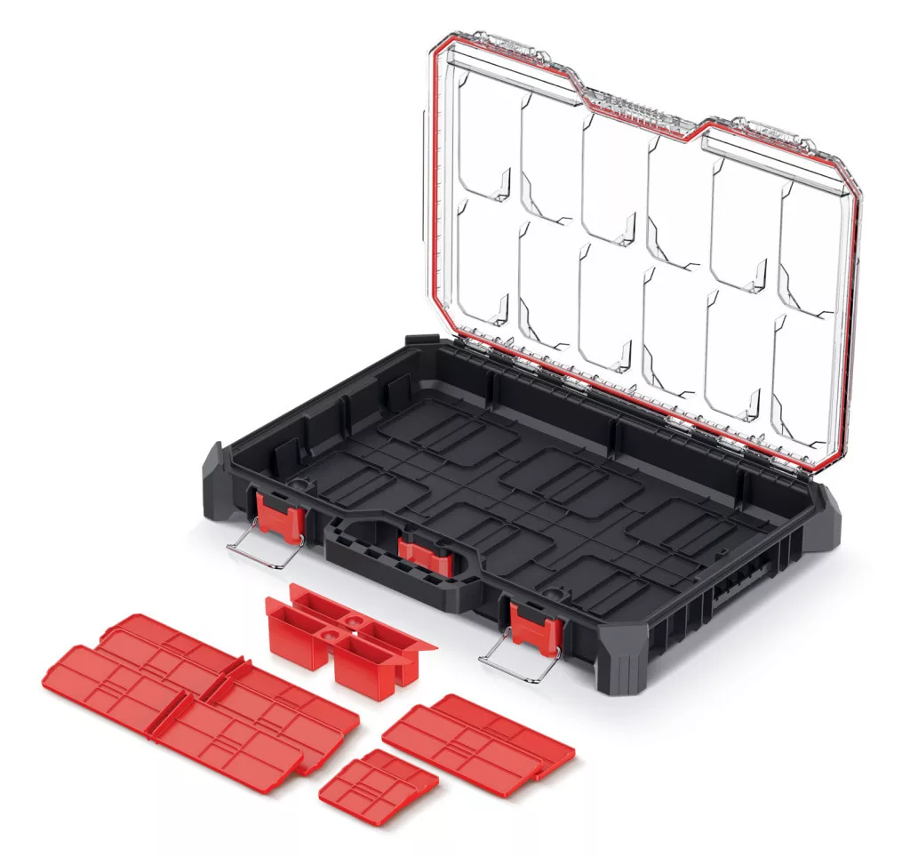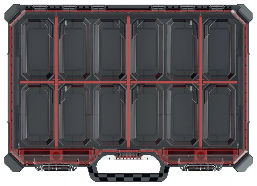 A rendező 7 állítható elválasztóval és 2 kivehető tárolórekesszel rendelkezik, amelyek rugalmas tárolási lehetőséget biztosítanak különböző méretű eszközök számára. Az átlátszó fedél gyors áttekinthetőséget tesz lehetővé, az ergonomikus fogantyú pedig kényelmes szállítást biztosít.