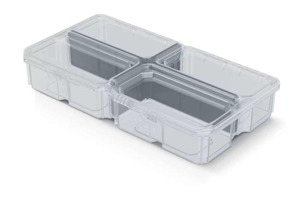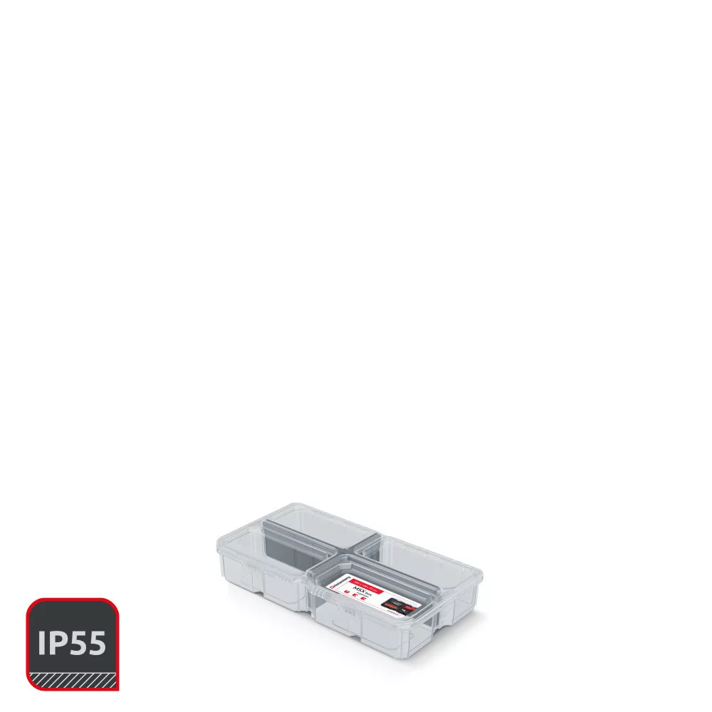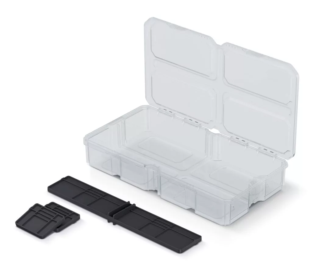Professzionális szerszámrendező doboz átlátszó fedéllel és kivehető elválasztókkal, IP55 védettséggel a hatékony szerszámtárolásért.