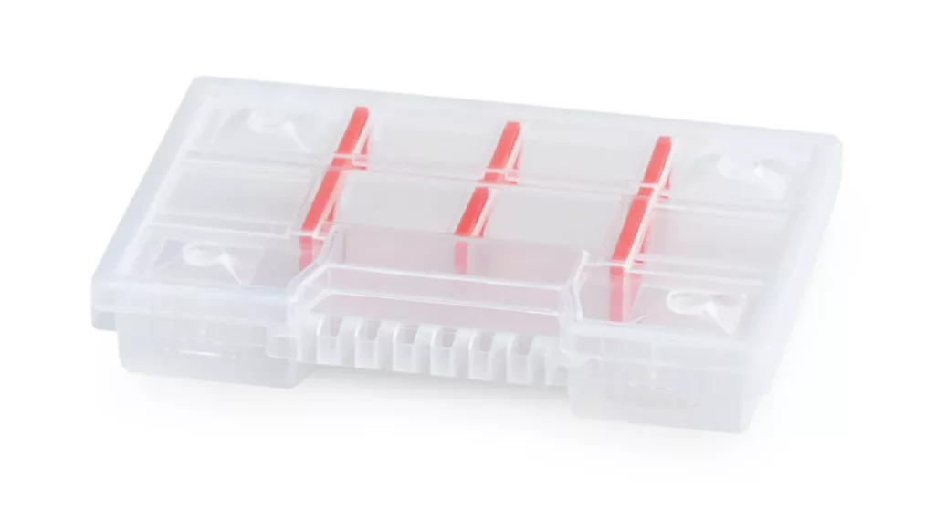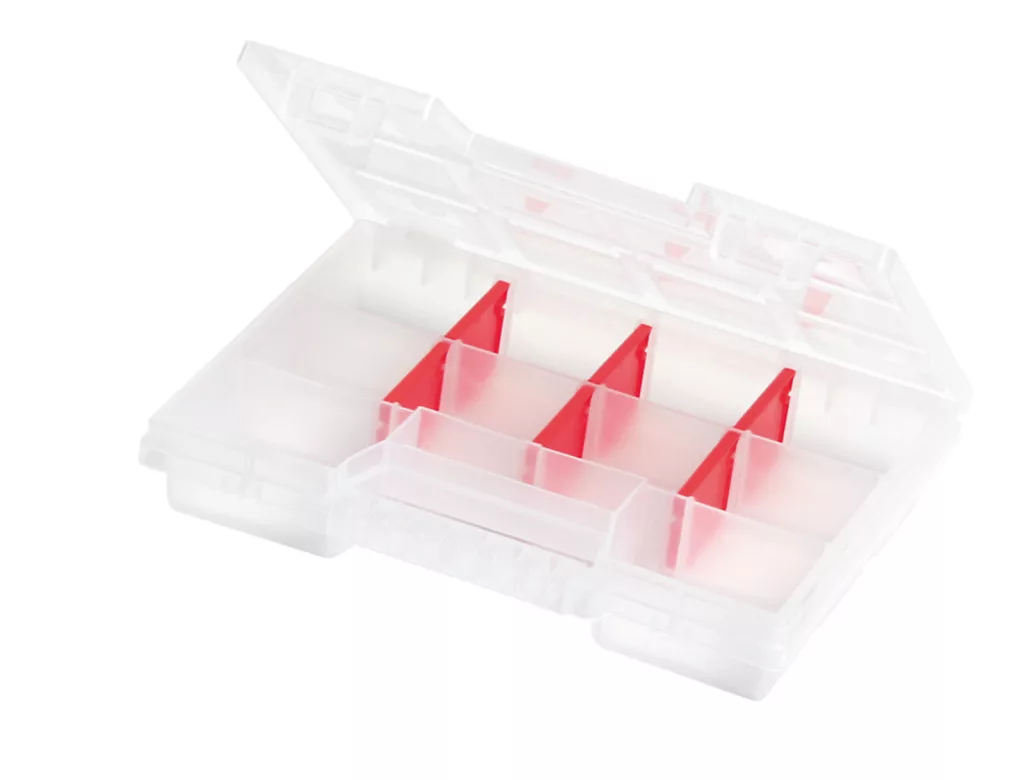 Praktikus, átlátszó szerszámrendező doboz 6 kivehető rekesszel, ergonomikus fogantyúval és strapabíró záróelemekkel.