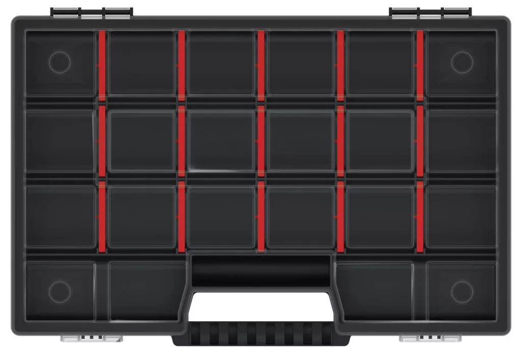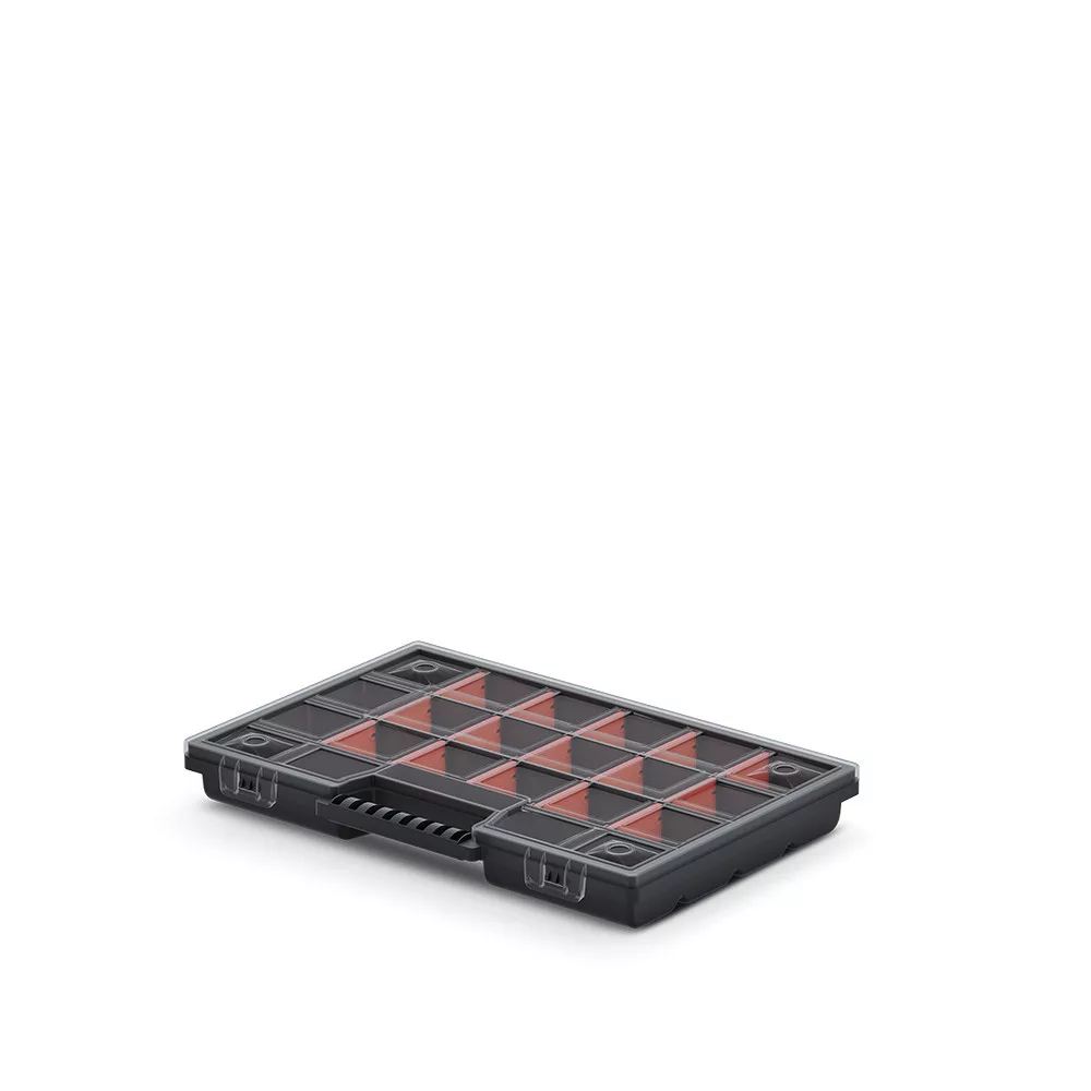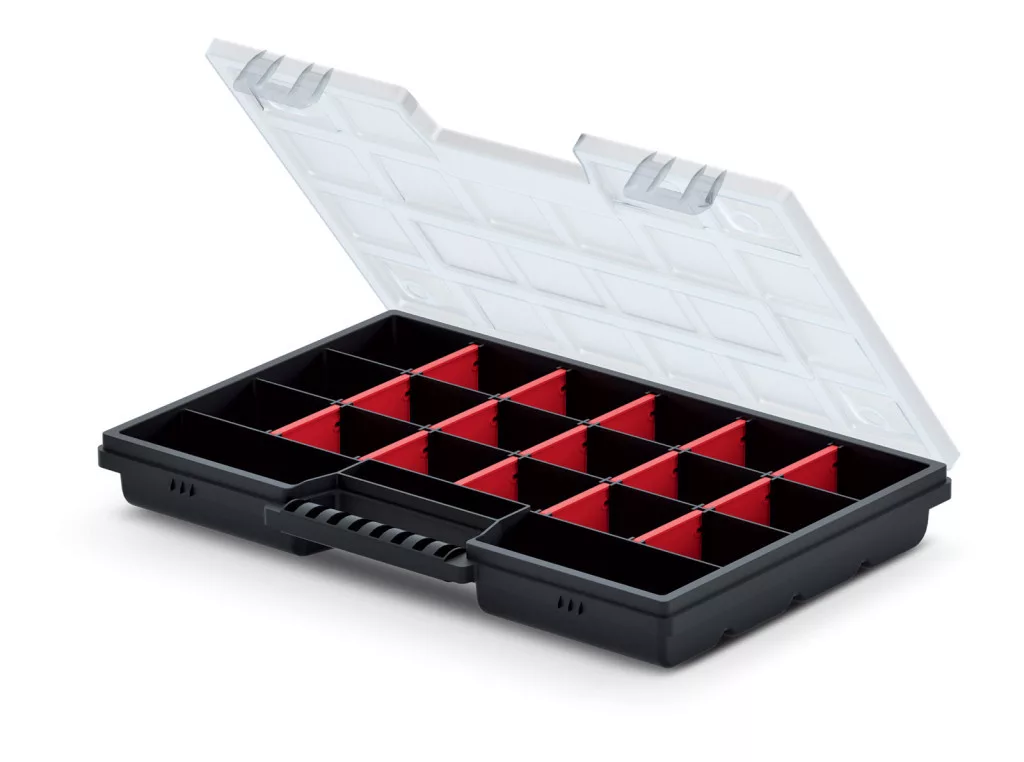 A NOR 30 szerszámrendező ideális megoldást kínál a szerszámok és apró alkatrészek rendszerezett tárolására. Az átlátszó PP fedél azonnali rálátást biztosít a tárolt eszközökre, míg a 15 kivehető rekesz maximális rugalmasságot nyújt a tárolótér személyre szabásában.