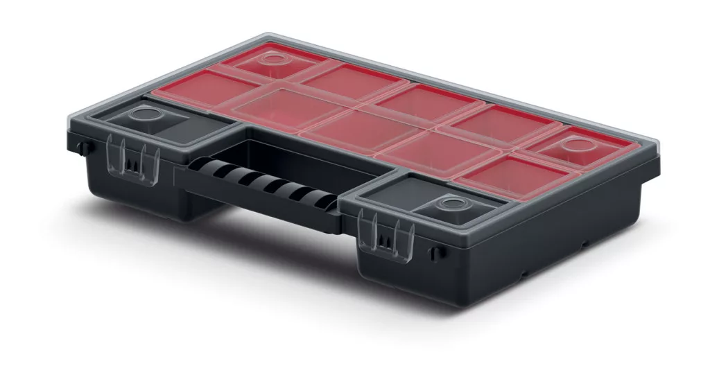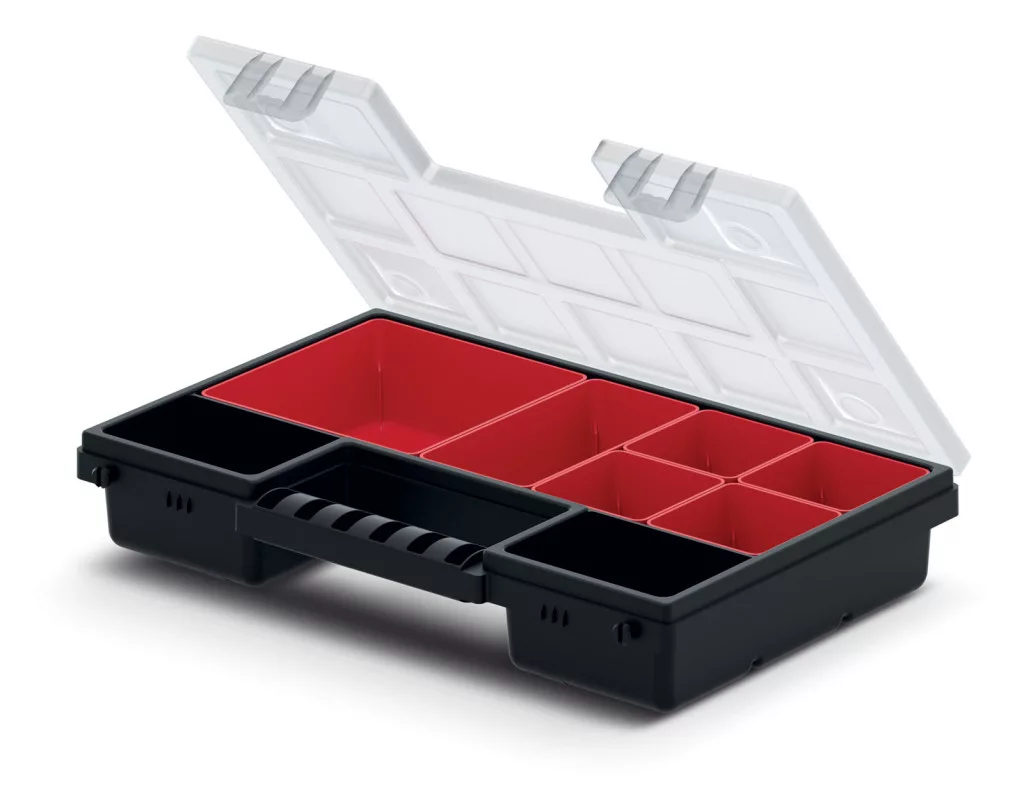 Az átlátszó fedél azonnal láthatóvá teszi a tárolt eszközöket, míg a robusztus zárórendszer megakadályozza a véletlen kinyílást. A kompakt méretű rendező ergonomikus fogantyúval van ellátva a könnyű hordozhatóság érdekében.