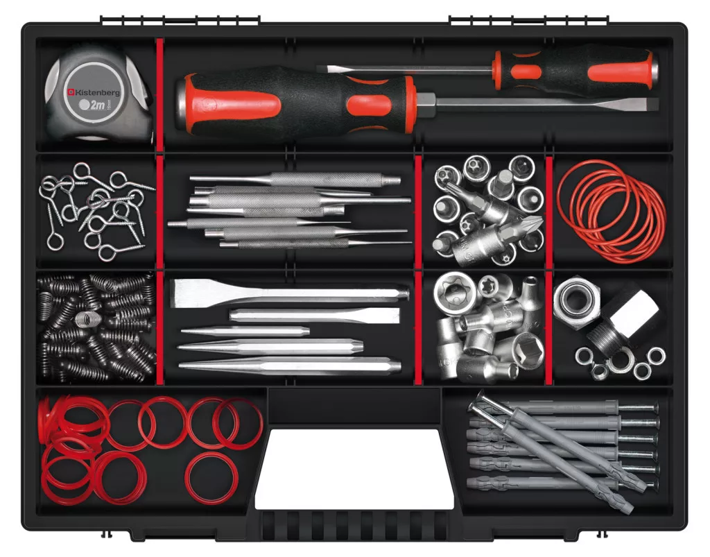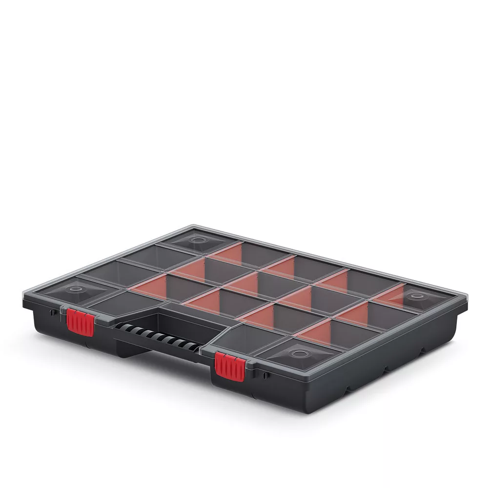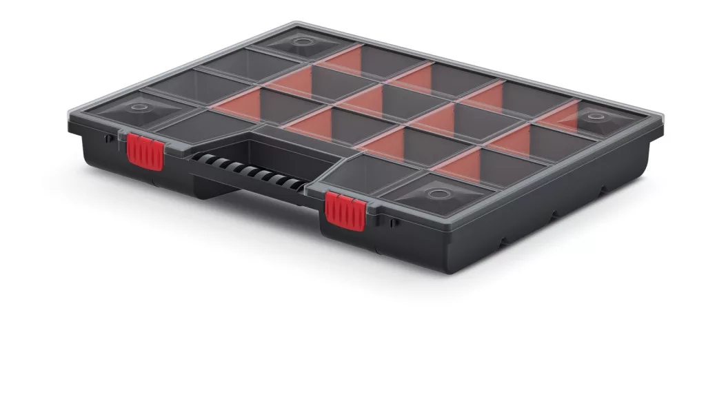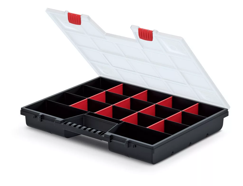 A NOR 50 szerszámrendező tökéletes megoldást kínál a műhelyek és otthoni szerszámok rendszerezésére. Az átlátszó PP fedél azonnali rálátást biztosít a tárolt eszközökre, míg a 12 kivehető rekesz maximális rugalmasságot garantál a különböző méretű szerszámok tárolásához.