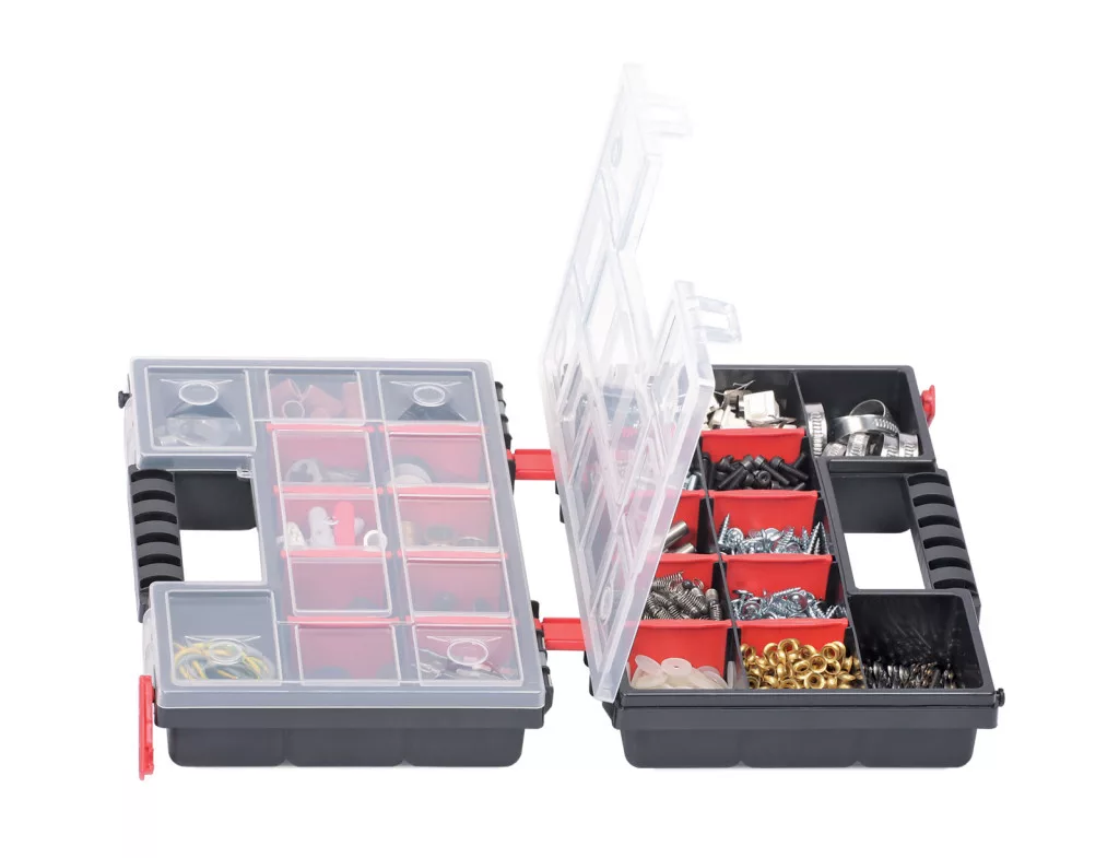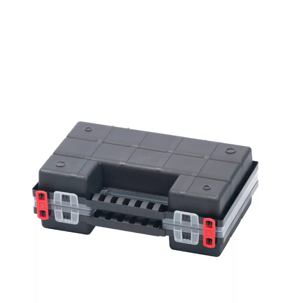 Praktikus dupla szerszámrendező szett 16 kivehető rekesszel, átlátszó fedéllel és ergonomikus fogantyúval a professzionális szerszámtároláshoz.