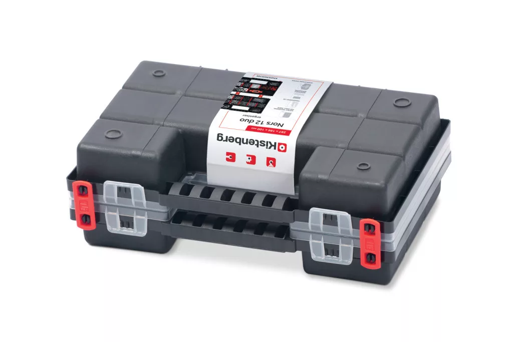 A NORS DUO 30 szerszámrendező két összekapcsolt tárolóegységből áll, amelyek tökéletes megoldást nyújtanak a szerszámok és kisalkatrészek rendszerezett tárolására. Az átlátszó PP fedél azonnali rálátást biztosít a tárolt eszközökre, míg az ergonomikus fogantyú kényelmes szállíthatóságot garantál.