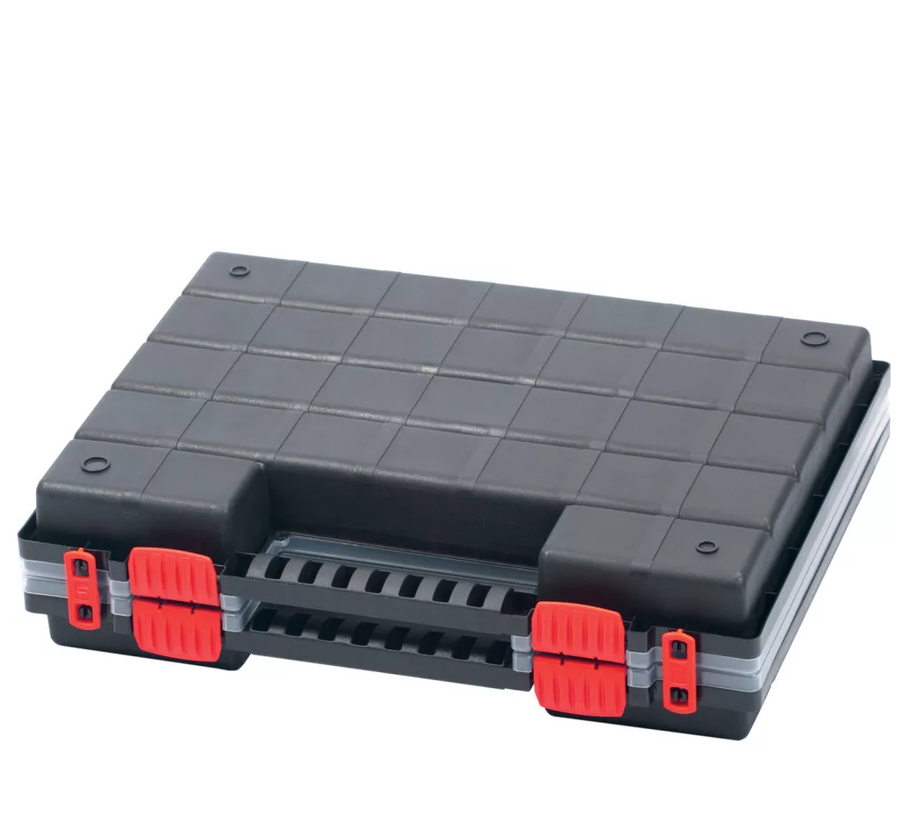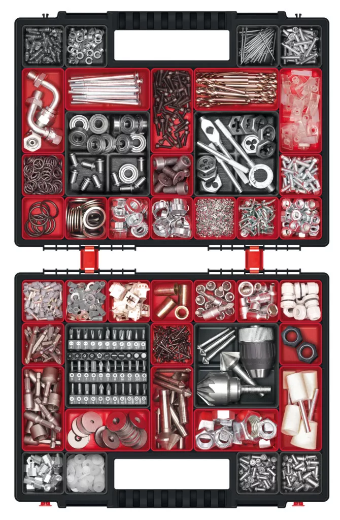 A 42 kivehető tárolórekesz rugalmas térkihasználást tesz lehetővé, és a piros-fekete színkombináció segít a tartalom gyors azonosításában. Az ergonomikus fogantyú és a megbízható zárócsatok kényelmes hordozhatóságot és biztonságos tárolást garantálnak.