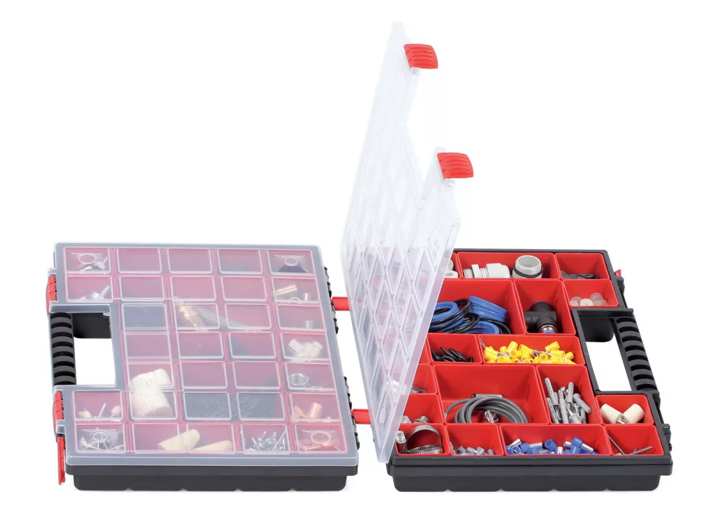 Professzionális dupla szerszámrendező táska 42 kivehető tárolórekesszel, átlátszó fedéllel és ergonomikus fogantyúval a maximális szervezettségért.
