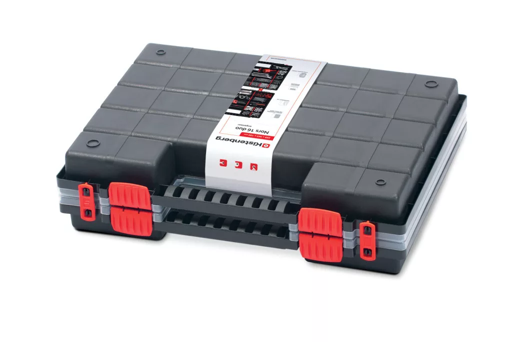 A NORS DUO 40 egy innovatív kettős szerszámrendező rendszer, amely két összekapcsolt NORS 40 tárolóból áll. Az átlátszó PP fedél azonnali rálátást biztosít a tárolt eszközökre, míg az ergonomikus fogantyú kényelmes szállítást tesz lehetővé.