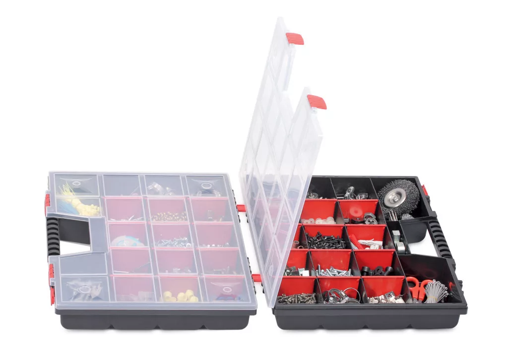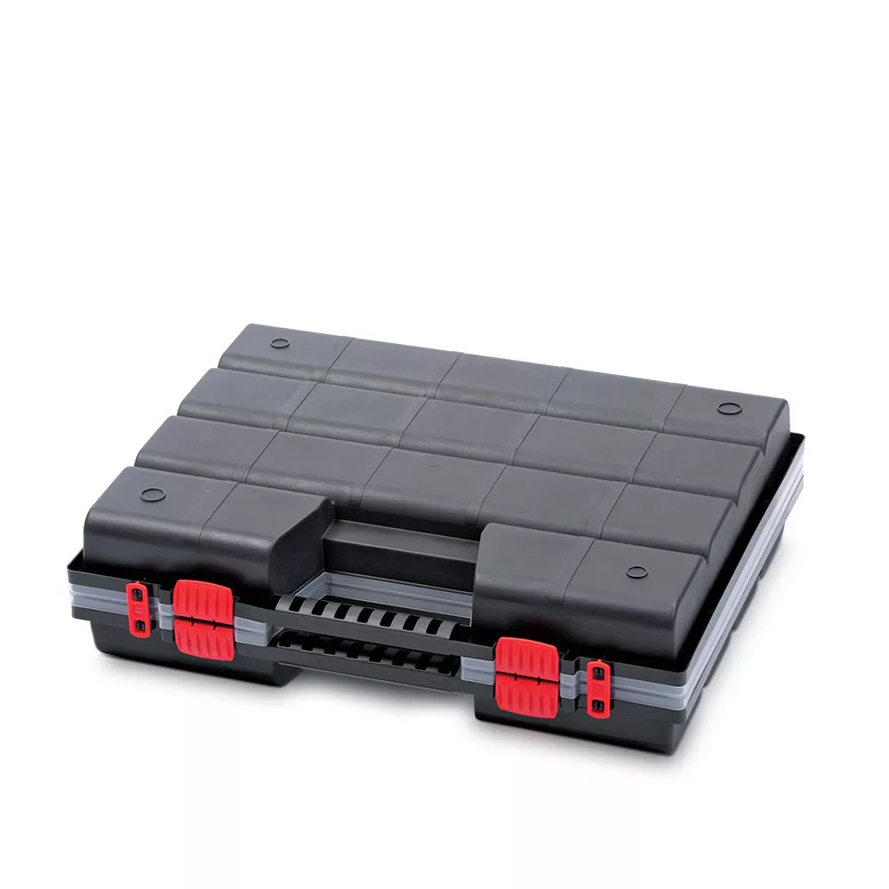 Professzionális dupla szerszámrendező táska 24 kivehető rekesszel, ergonomikus fogantyúval és átlátszó fedéllel a könnyű áttekinthetőség érdekében.