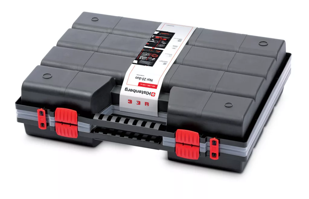 A NOR DUO 50 szerszámrendező két összekapcsolt NOR 50 tárolóegységből áll, amely tökéletes megoldást kínál a szerszámok rendszerezett tárolására. Az átlátszó polipropilén fedél azonnali rálátást biztosít a tárolt eszközökre, míg a strapabíró polimer ház garantálja a hosszú élettartamot.