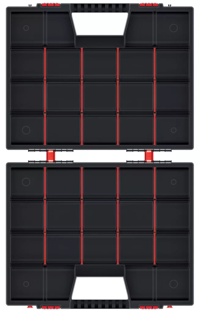 A 24 kivehető rekesz rugalmas térkialakítást tesz lehetővé, az ergonomikus fogantyú pedig kényelmes szállítást biztosít. A megbízható záróelemek biztonságosan tartják a szerszámokat szállítás közben is.