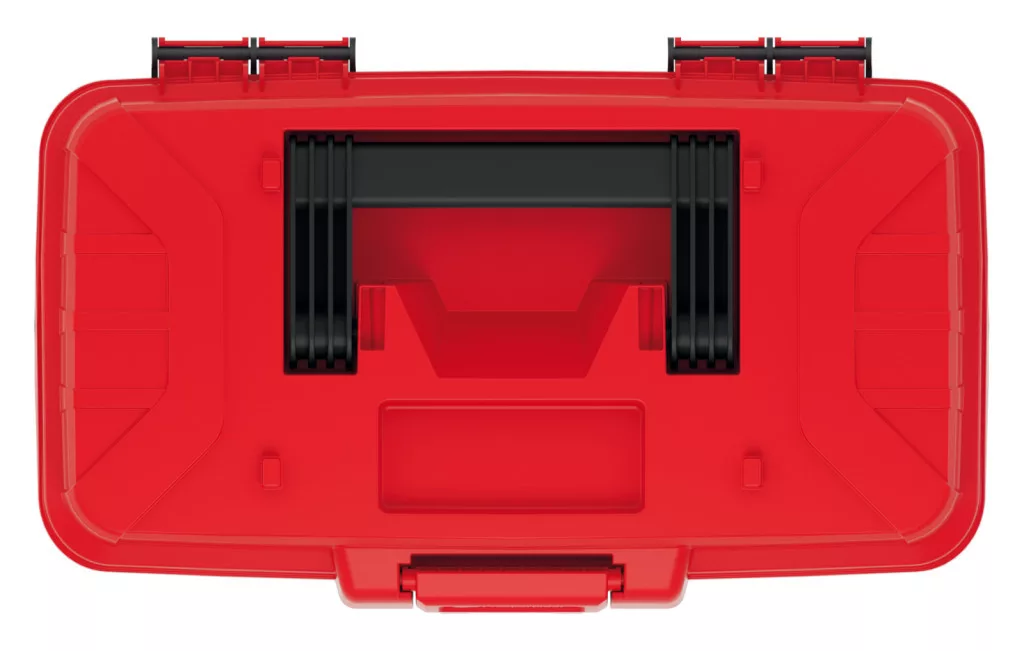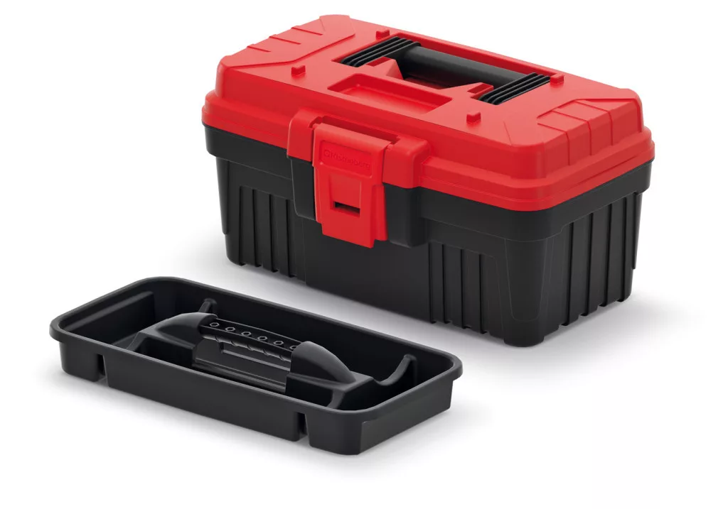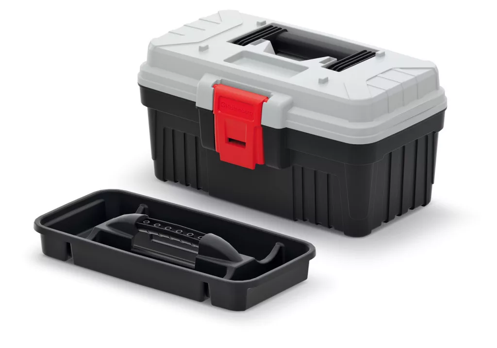 Kompakt és strapabíró műanyag szerszámosláda kivehető rendszerezőtálcával, ergonomikus fogantyúval és 6 kg teherbírással.