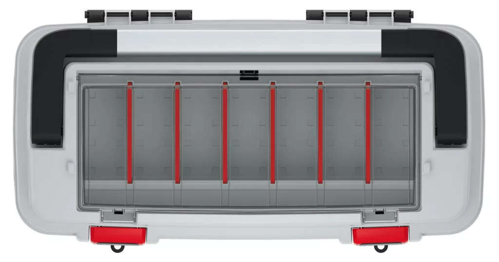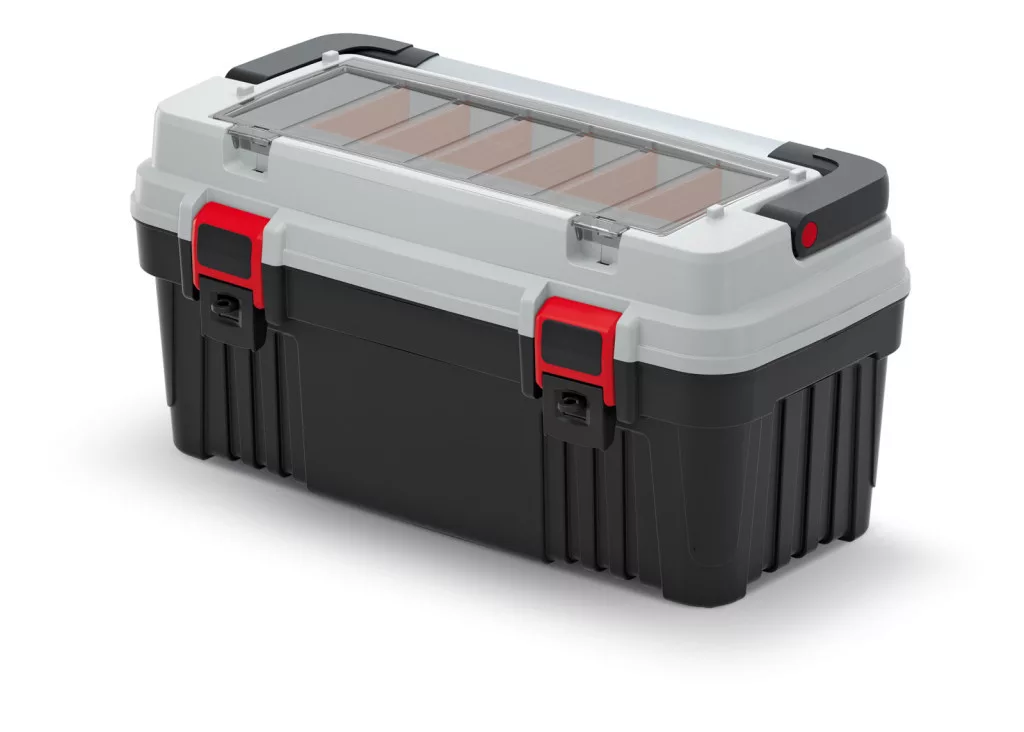 A láda különlegessége az innovatív kialakítás, amely lehetővé teszi, hogy a teljesen kinyitott fedél munkafelületként szolgáljon az alumínium fogantyú támasztékként való használatával. A polikarbonát fedéllel ellátott rendszerező és a 6 kivehető válaszfal tökéletes rendet biztosít a kisebb alkatrészek tárolásában.