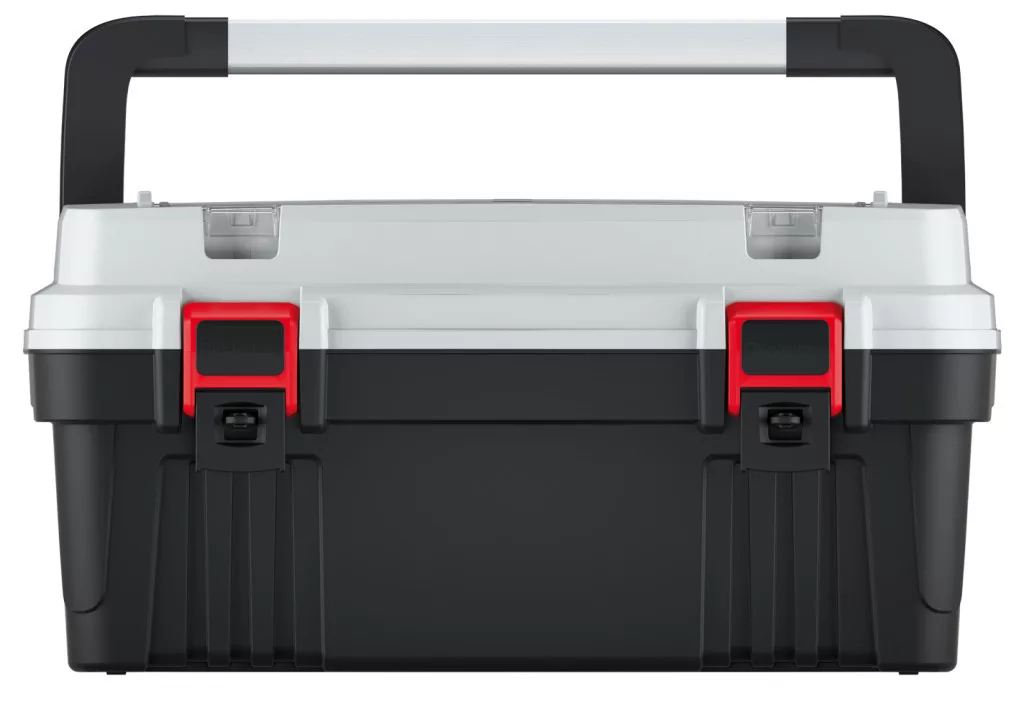 Strapabíró, 20 kg teherbírású szerszámosláda beépített rendszerezővel és innovatív alumínium fogantyúval, amely munkafelületként is használható.