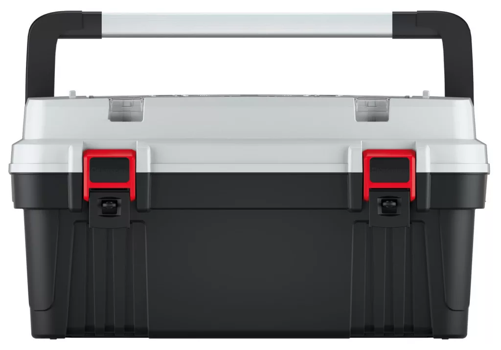 Strapabíró, 25 kg teherbírású szerszámosláda beépített szervezőrendszerrel és alumínium fogantyúval, ami ideális választás szakemberek és barkácsolók számára.