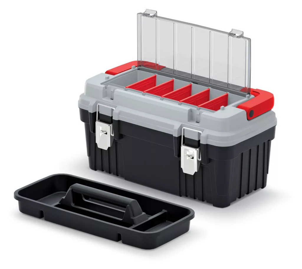 Strapabíró, sokoldalú szerszámosláda beépített szervezőrendszerrel és 25 kg teherbírással, ideális szakemberek és barkácsolók számára.
