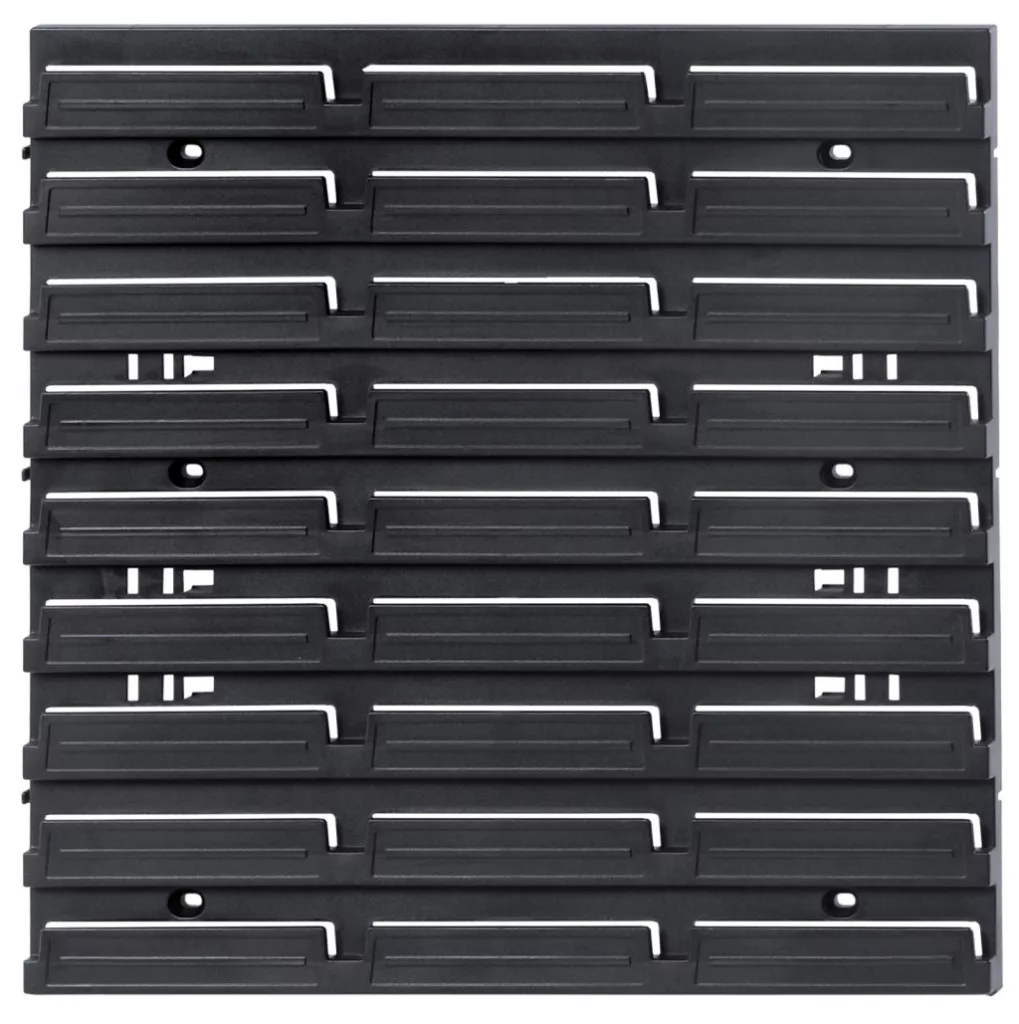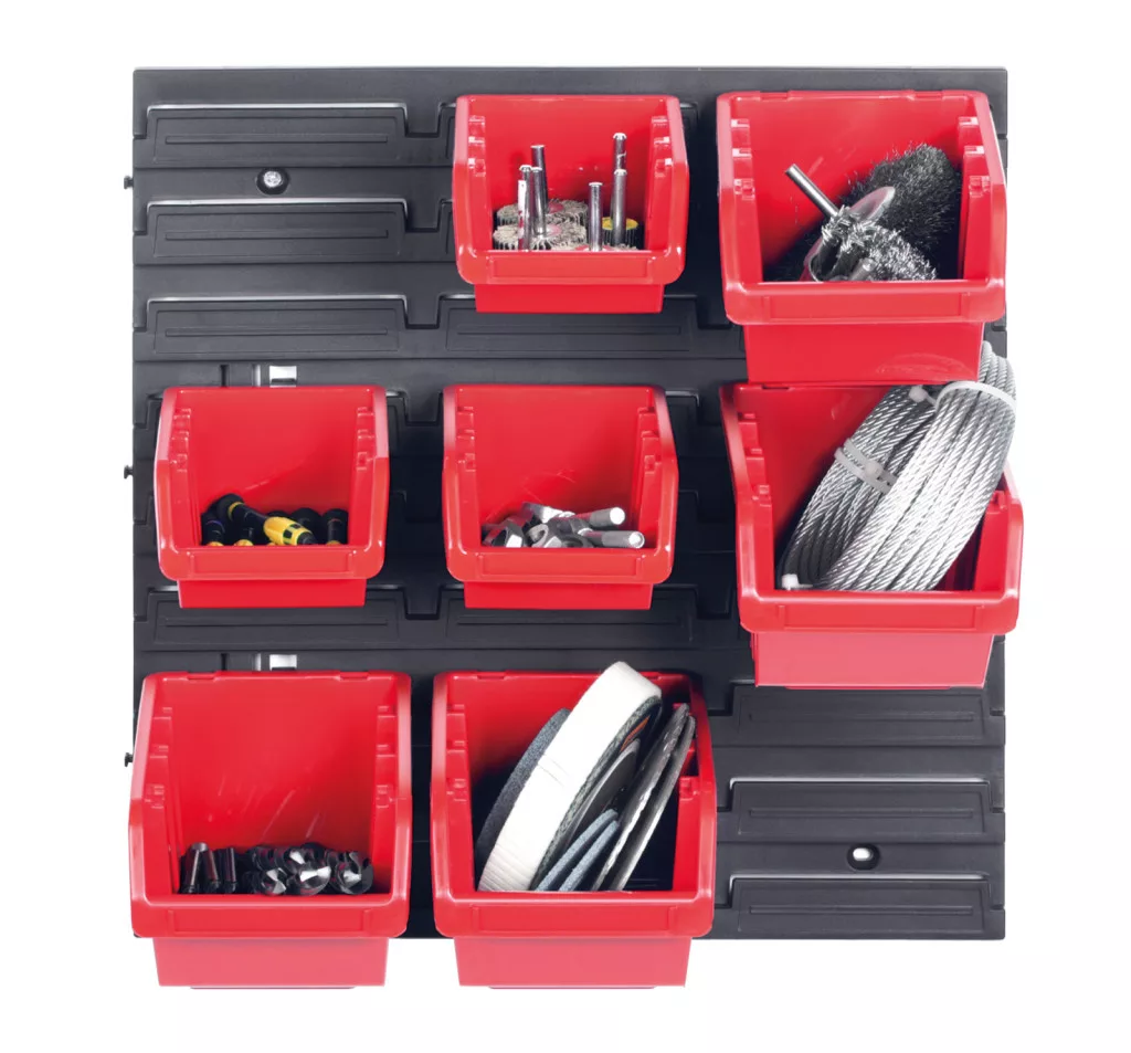 Professzionális fali szerszámtartó panel 7 tárolódobozzal, ideális műhelyek és garázsok rendszerezett eszköztárolásához.