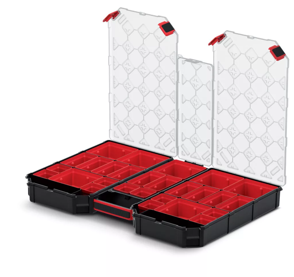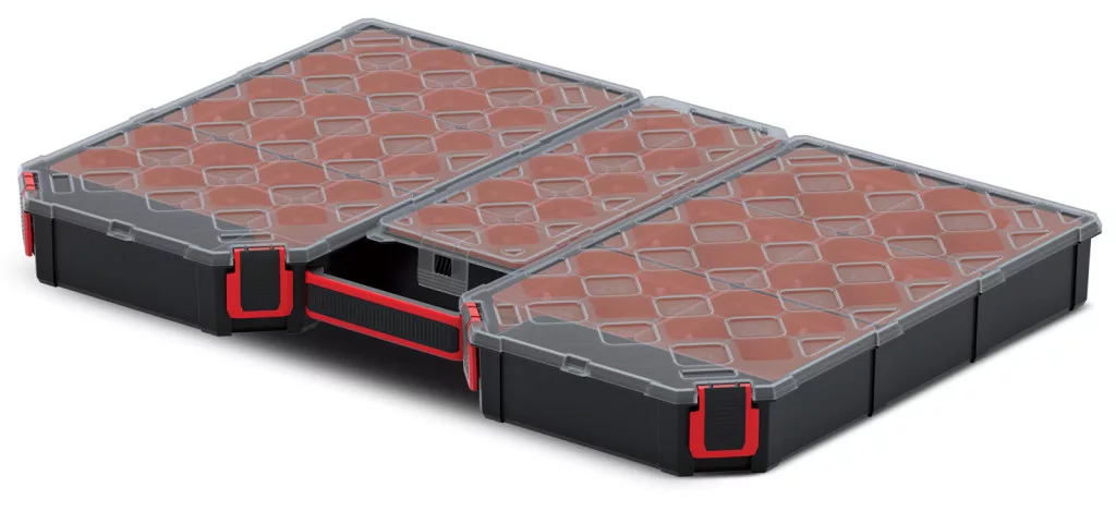 Kompakt, alacsony profilú szerszámrendező 27 kivehető rekesszel, átlátszó polipropilén fedéllel és ergonomikus fogantyúval a maximális szervezettség érdekében.