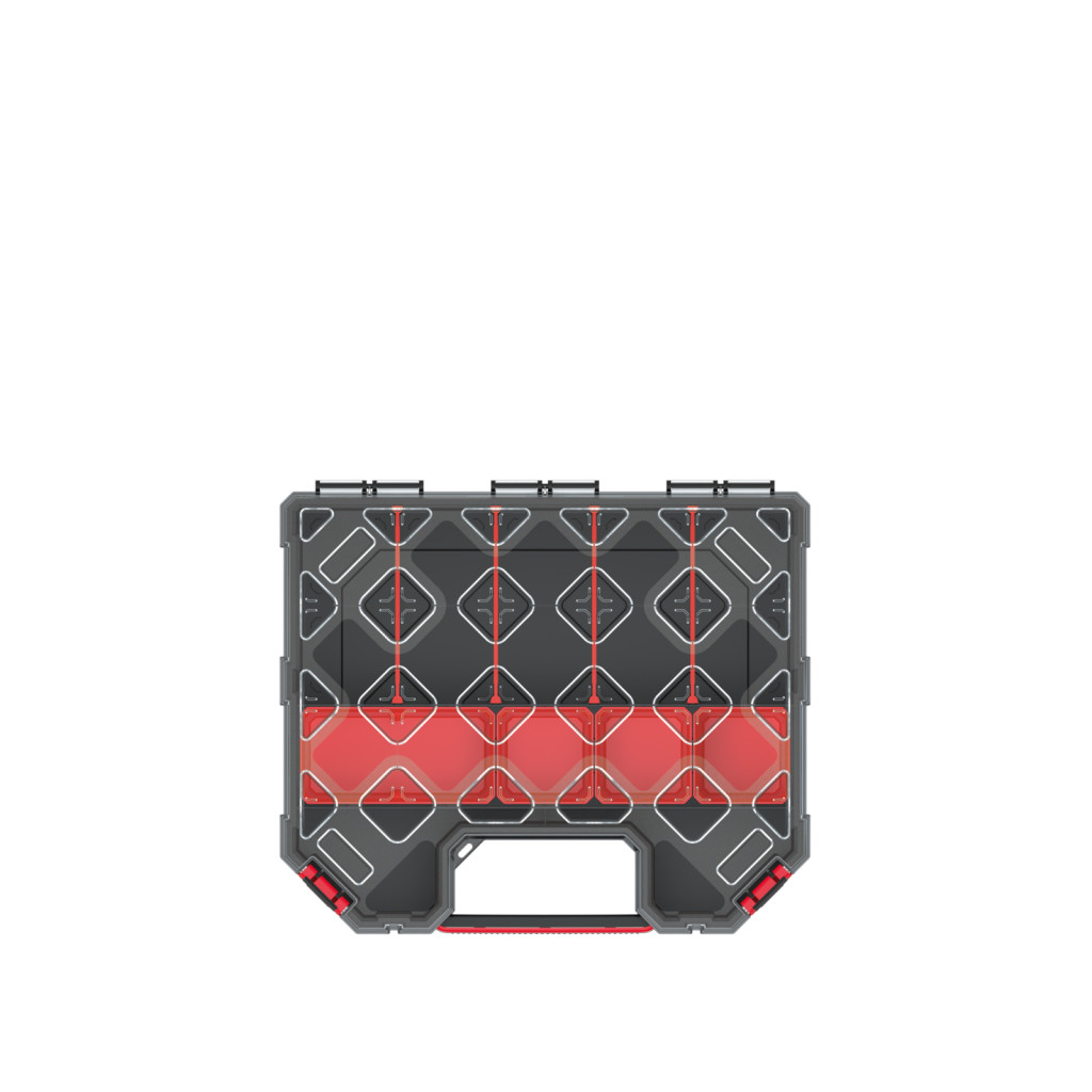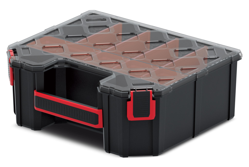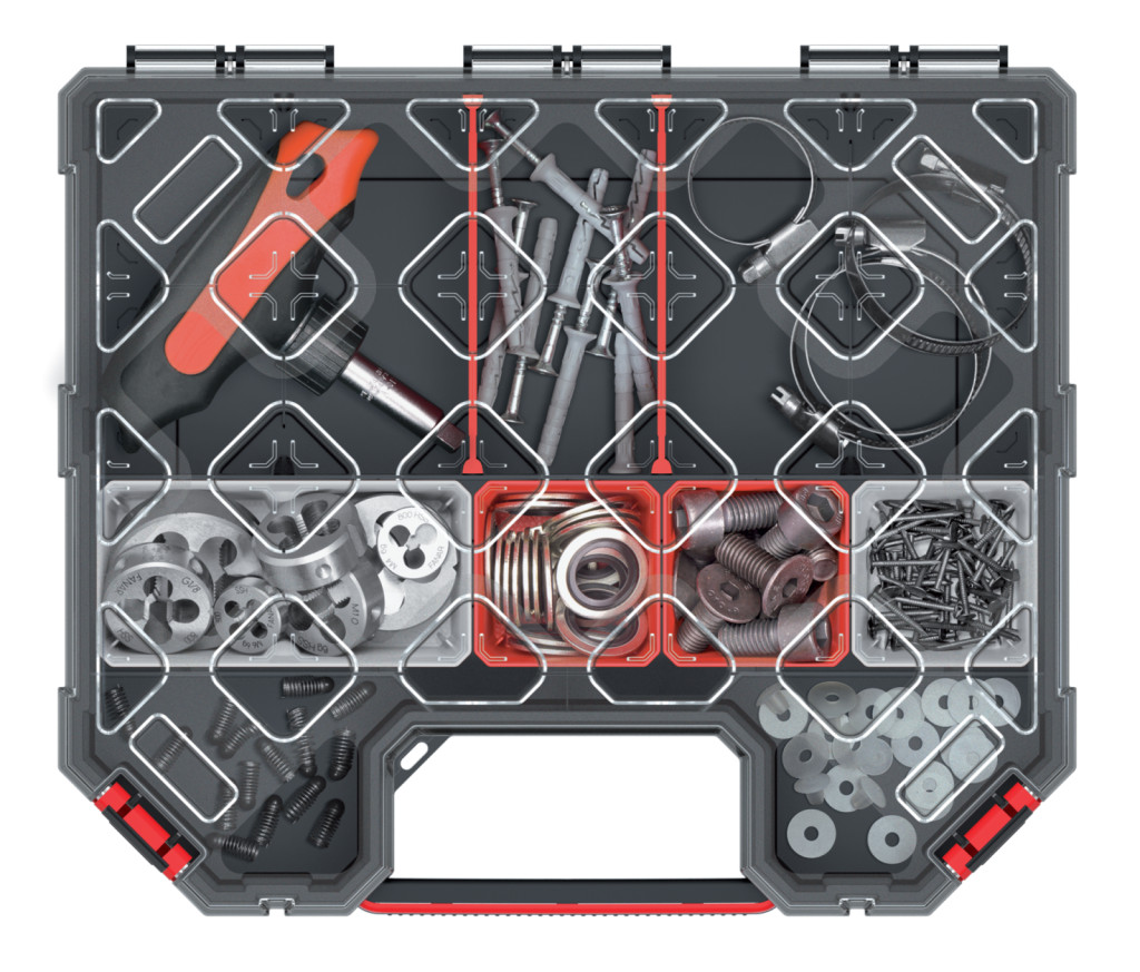 A rendező 4 kivehető elválasztóval és 3 praktikus tárolórekesszel rendelkezik, amelyek testre szabható tárolási lehetőséget biztosítanak különböző méretű szerszámok és alkatrészek számára. Az ergonomikus fogantyú és a megbízható zárak könnyű hordozhatóságot garantálnak.