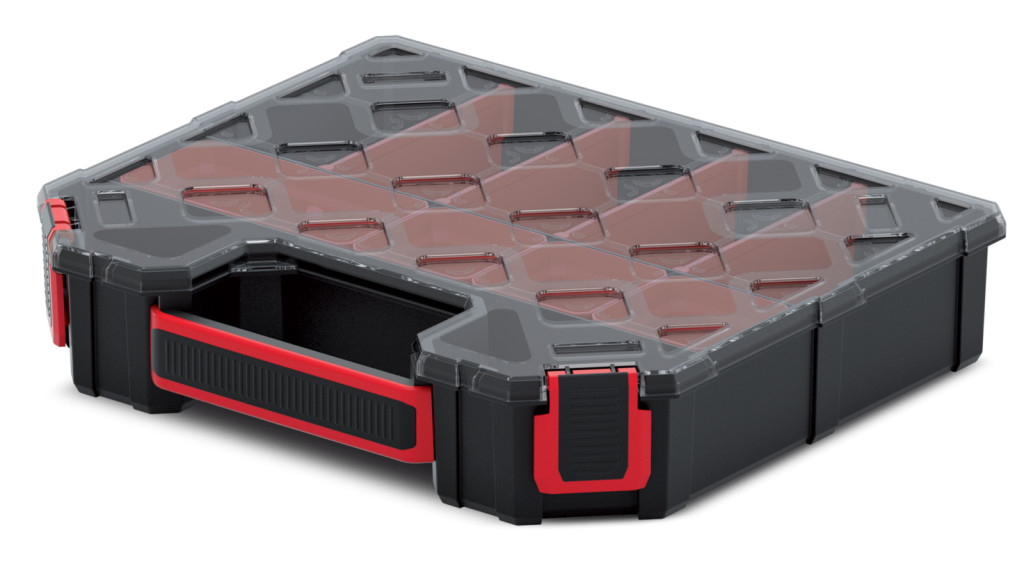 A rendező 4 kivehető elválasztóval és 3 praktikus tárolórekesszel rendelkezik, amelyek testre szabható tárolóteret biztosítanak különböző méretű szerszámok és alkatrészek számára. Az ergonomikus fogantyú és a megbízható zárórendszer könnyű hordozhatóságot és biztonságos tárolást tesz lehetővé.